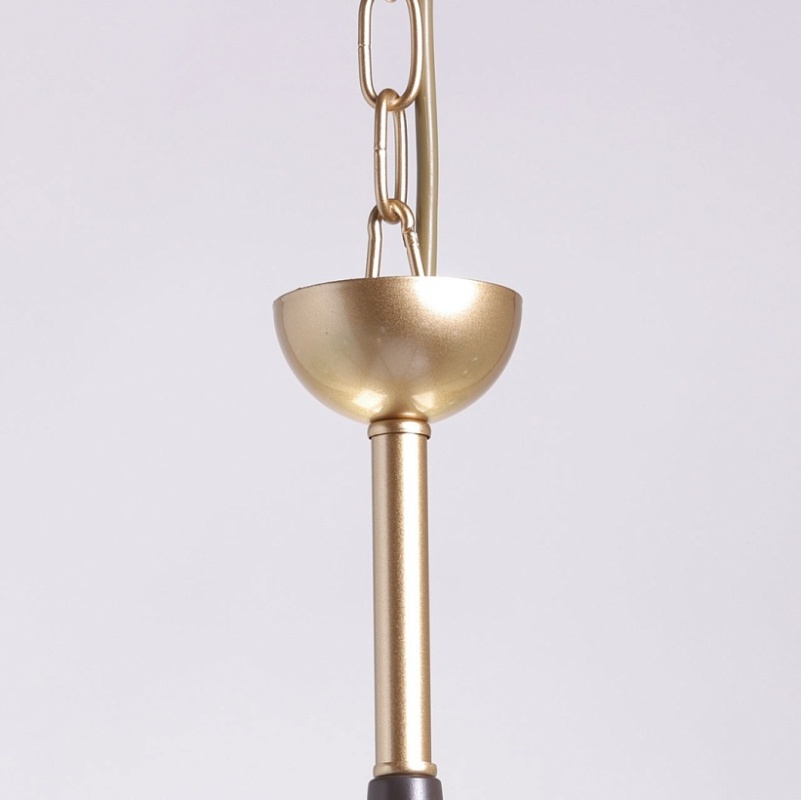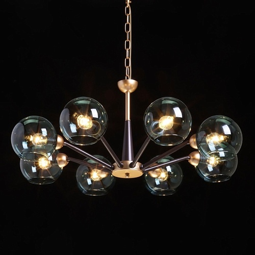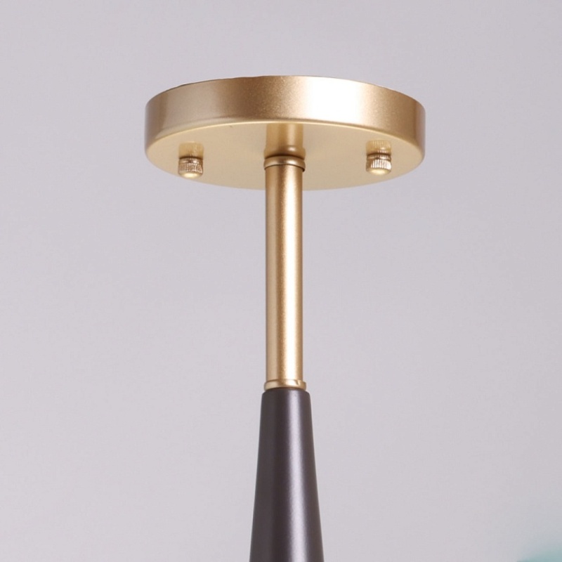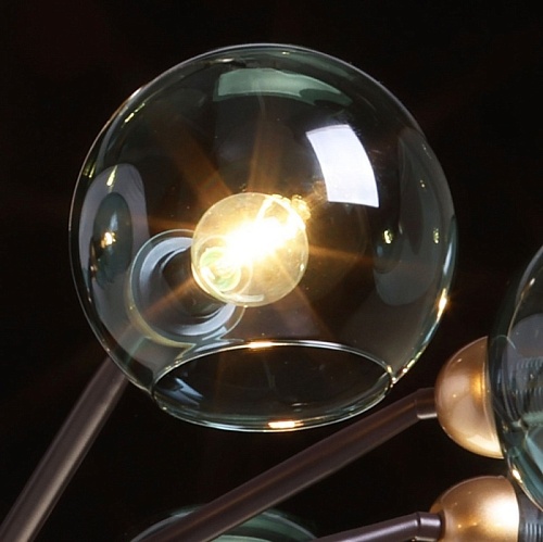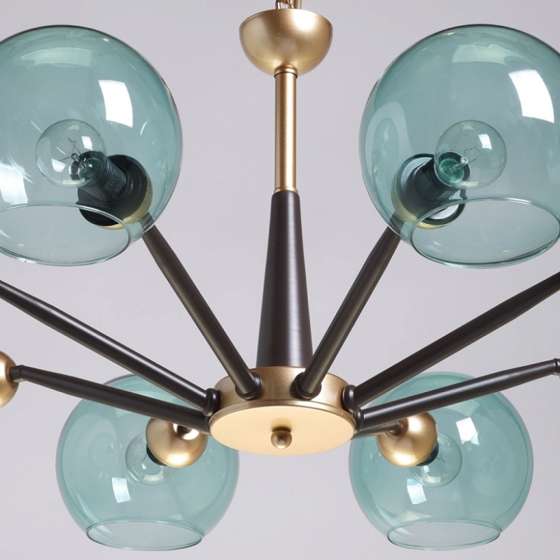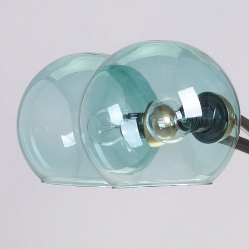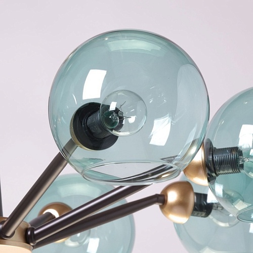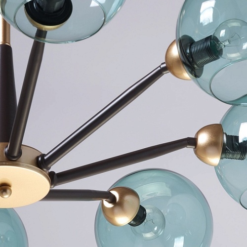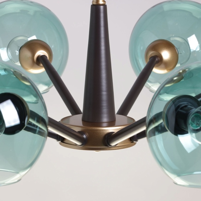Металлическое основание подвесной люстры гальванизировано в цвет матового золота. Отдельные элементы основания окрашены в темно-коричневый цвет. Стеклянные плафоны окрашены в массе в зелено-голубой цвет и выдуваются вручную в форму. Края плафонов оплавлены.