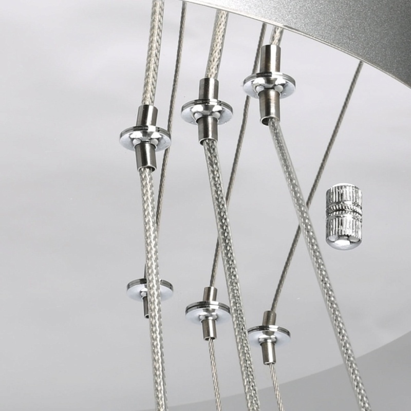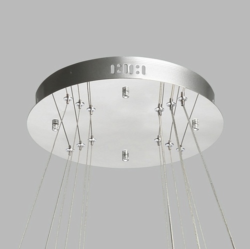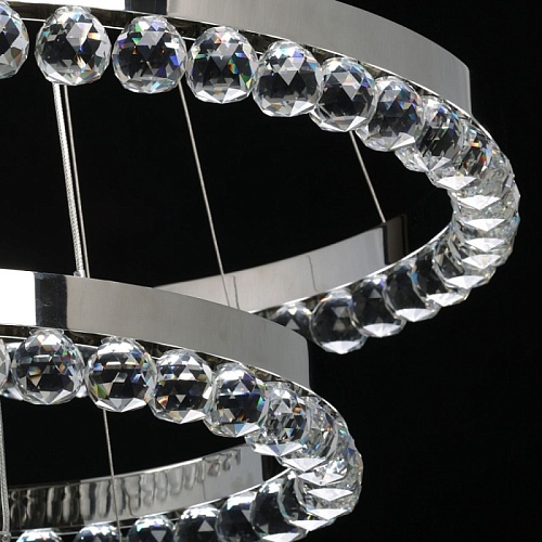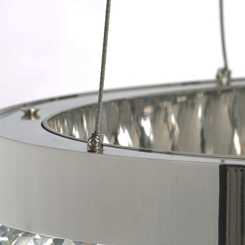 Металлическая потолочная чаша гальванизирована в цвет хрома. Корпус плафонов выполнен из нержавеющей стали, отполированной до зеркального блеска. Подвесная люстра декорирована прозрачным хрусталем в форме шаров.