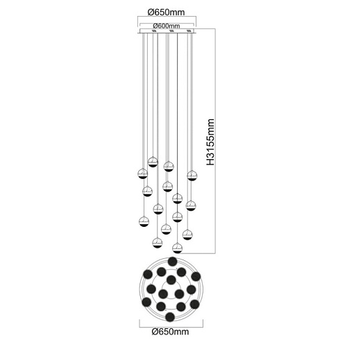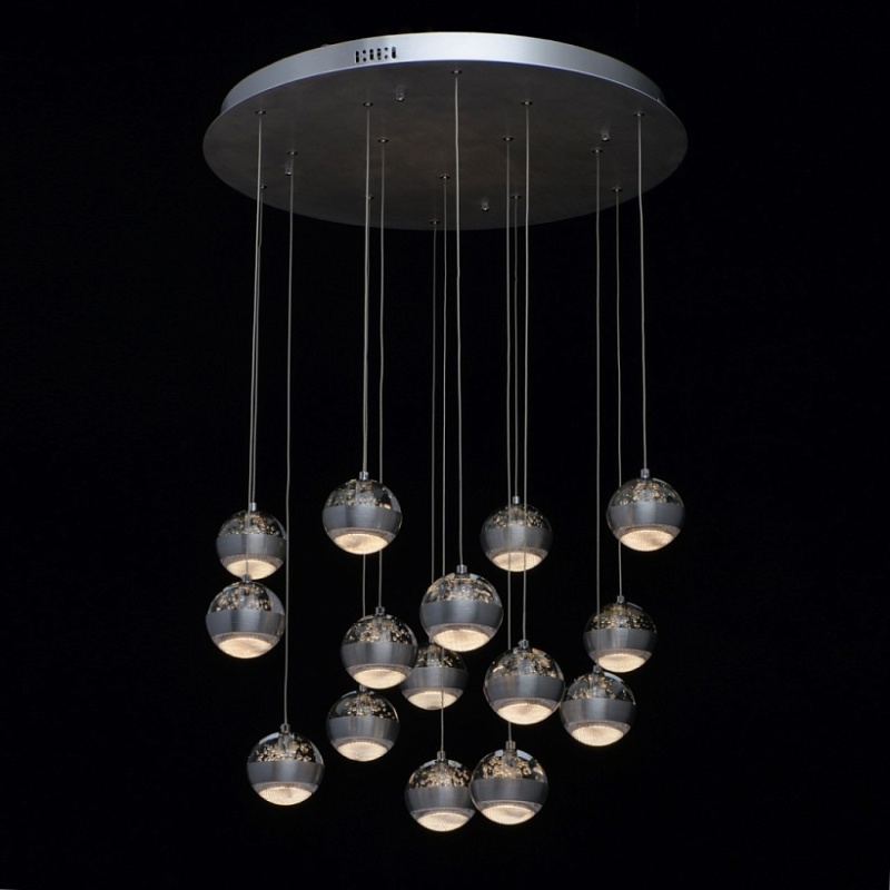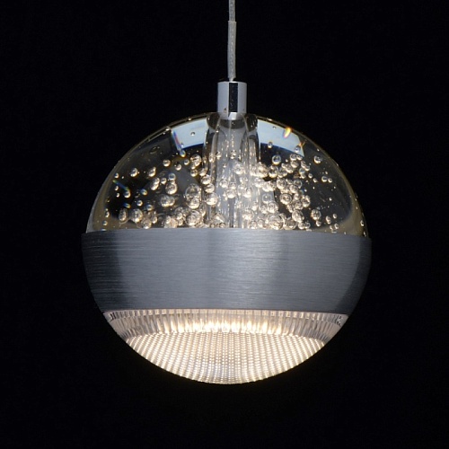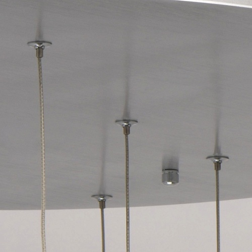 Основание светильника выполнено из комбинации сплавов металлов. Потолочная чаша выполнена из металла и окрашена в цвет серебра. Потолочная чаша закрыта пластиной из сплава алюминия цвета античного серебра, обработанного по технологии браширования с последующим патинированием.Плафоны на подвесах в виде тросов: каркасы плафонов выполнены из сплава алюминия цвета античного серебра и обработаны по технологии браширования с последующим патинированием. В верхней части плафонов светодиодный источник света типа SMD chip закрыт стеклом, отлитым в форму и обработанным по технологии пулегозо, при которой в плафоне образуются пузырьки. В нижней части плафона второй светодиодный источник света типа SMD chip закрыт прозрачным акрилом с фактурой сот.