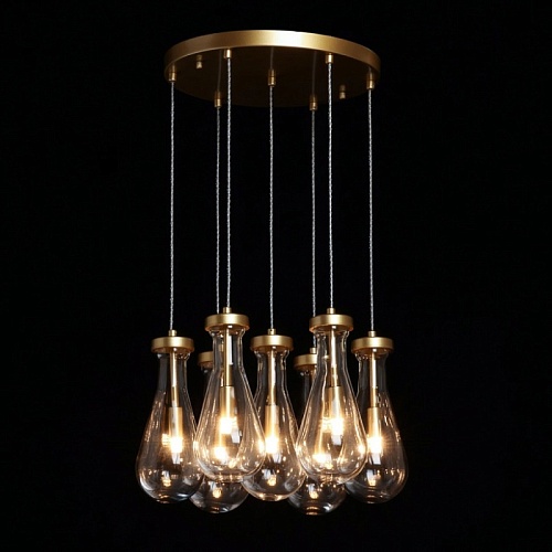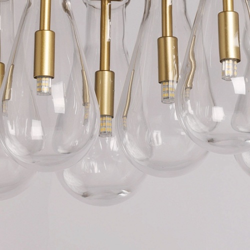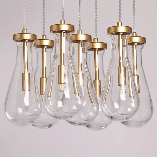 Металлическое основание подвесной люстры окрашено в цвет матового золота. Светильник декорирован оригинальными плафонами обтекаемой формы, выполненными из прозрачного, выдувного вручную стекла