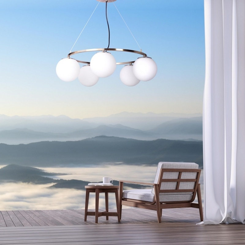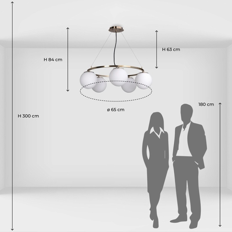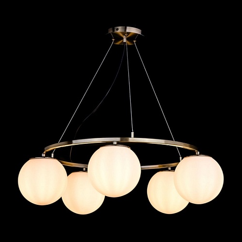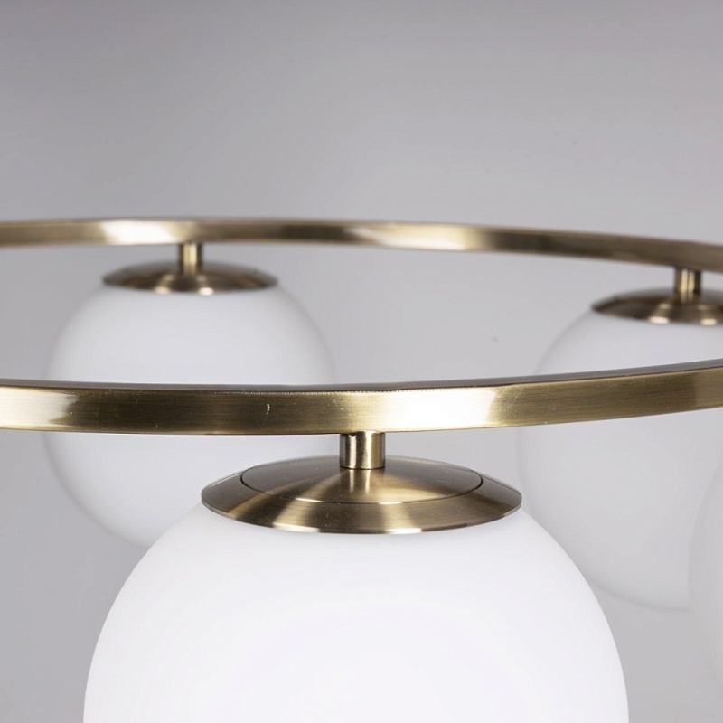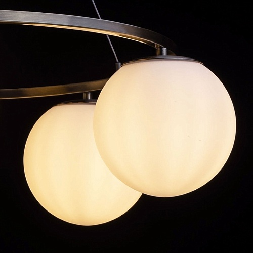 Металлическое основание светильника гальванизировано в цвет античной бронзы. Подвесная люстра декорирована стеклянными плафонами белого цвета.