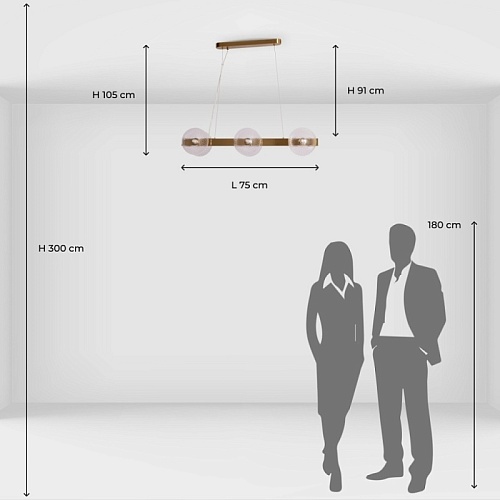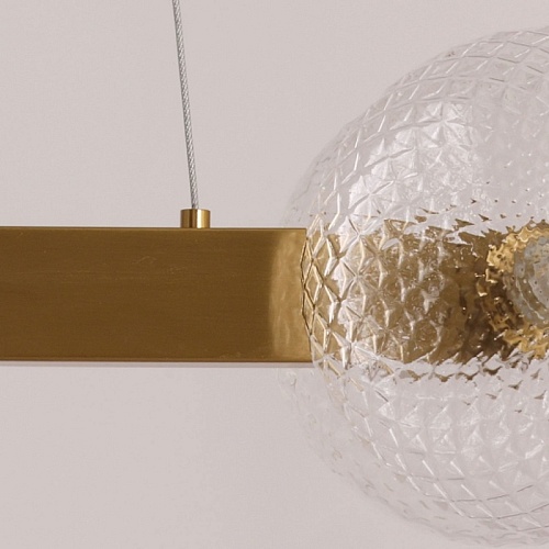 Металлическое основание подвесной люстры гальванизировано в цвет латуни. Светильник декорирован полусферами из прозрачного фактурного стекла.