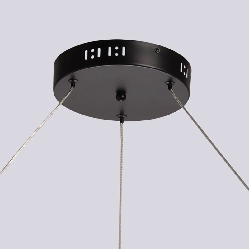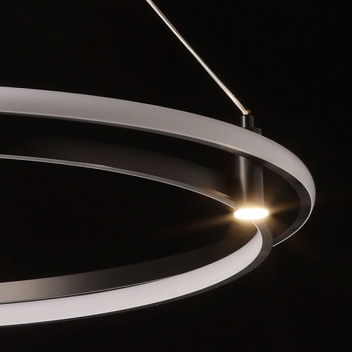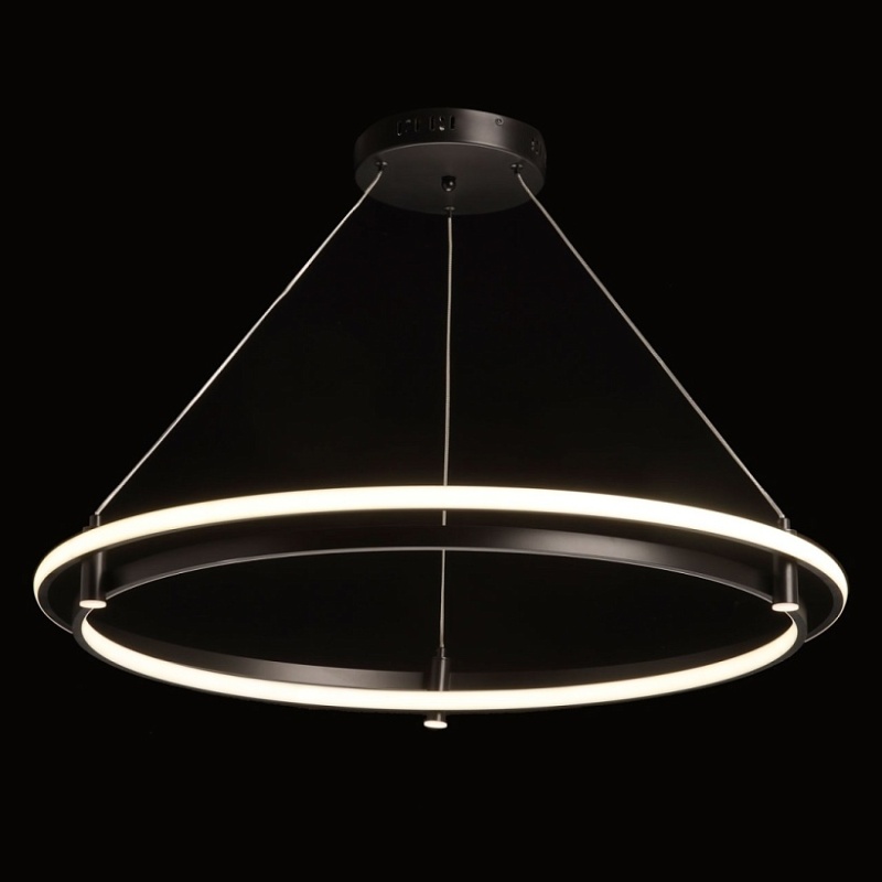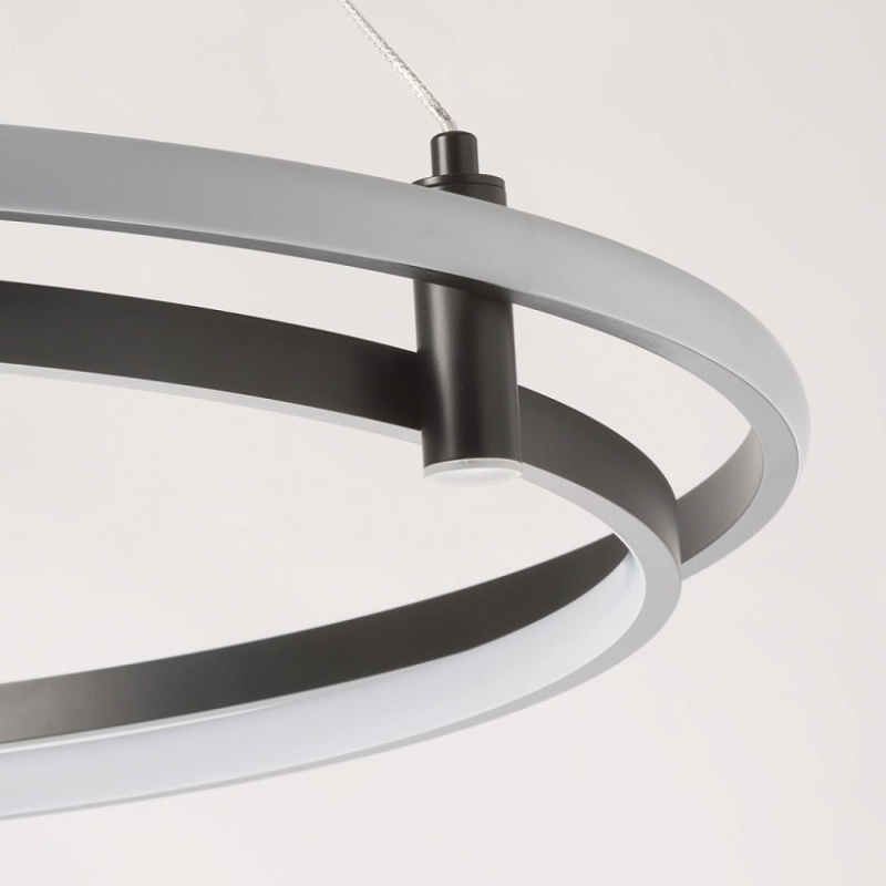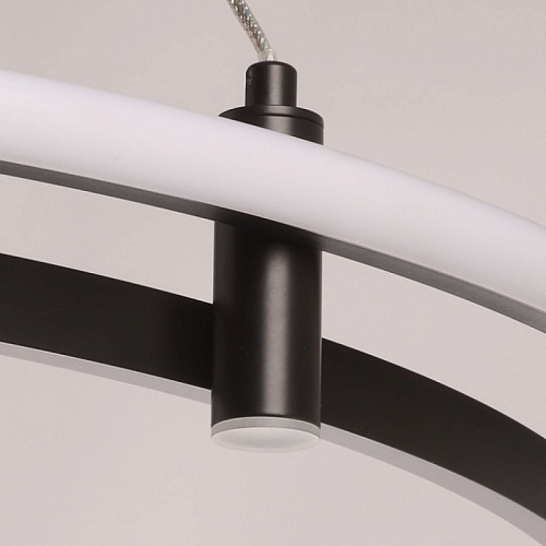 Металлическая потолочная чаша подвесной люстры окрашена в черный цвет. Плафон выполнен из сплава алюминия с цинком и окрашен в цвет основания. Светодиодные источники света закрыты белым матовым силиконом.