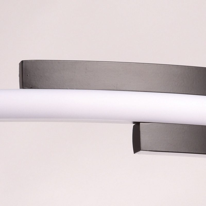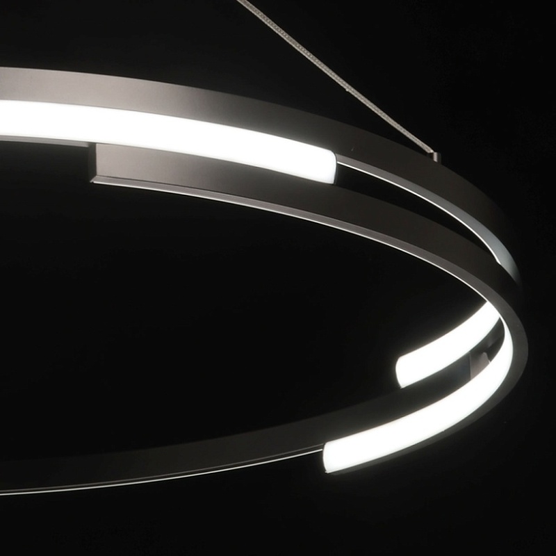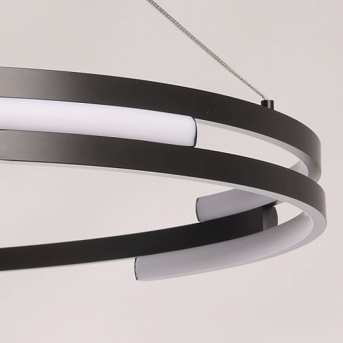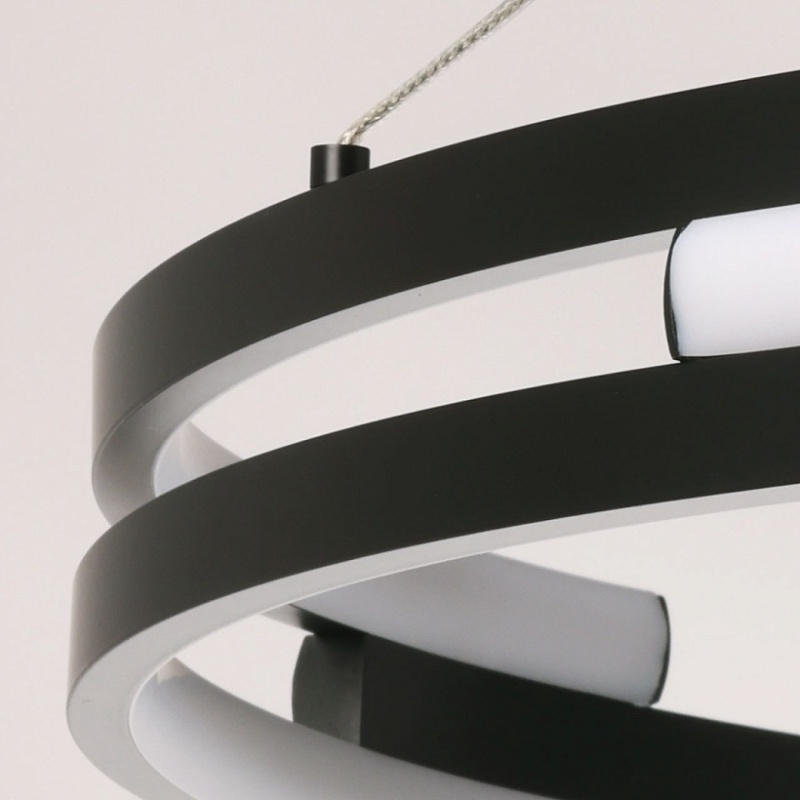 Металлическая потолочная чаша подвесной люстры окрашена в черный цвет. Плафон выполнен из сплава алюминия с цинком и окрашен в цвет основания. Светодиодные источники света закрыты белым матовым силиконом.