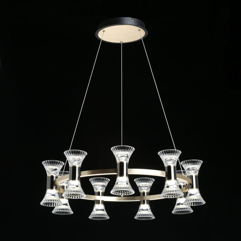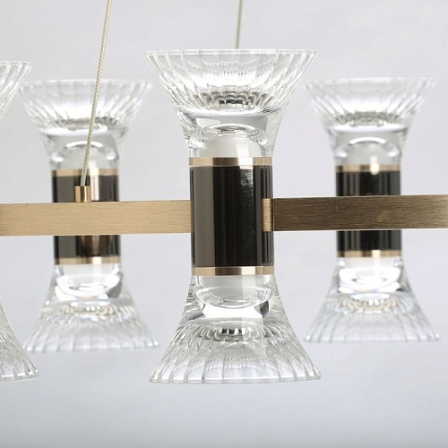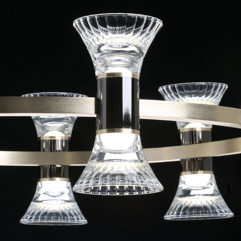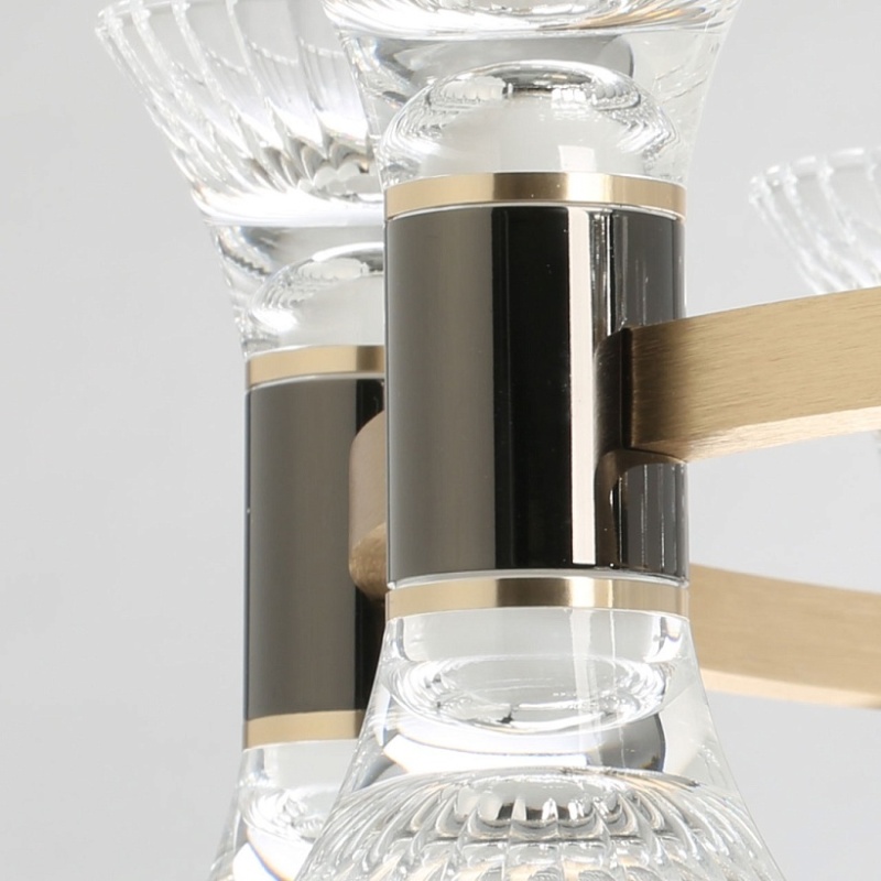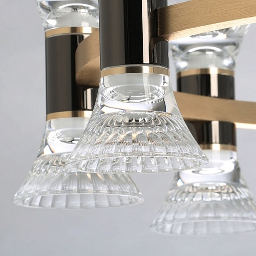Основание светильника выполнено из металла и гальванизировано в цвет золота. Светильник декорирован прозрачными плафонами из акрила, отлитыми в сложную форму, ряд деталей с гальваническим покрытием черного цвета.