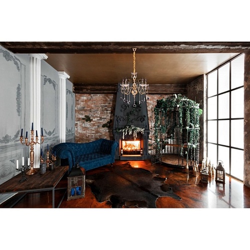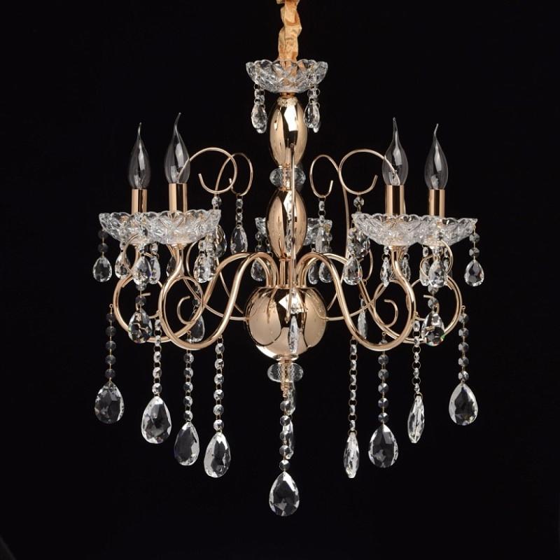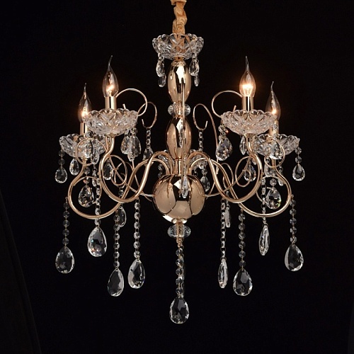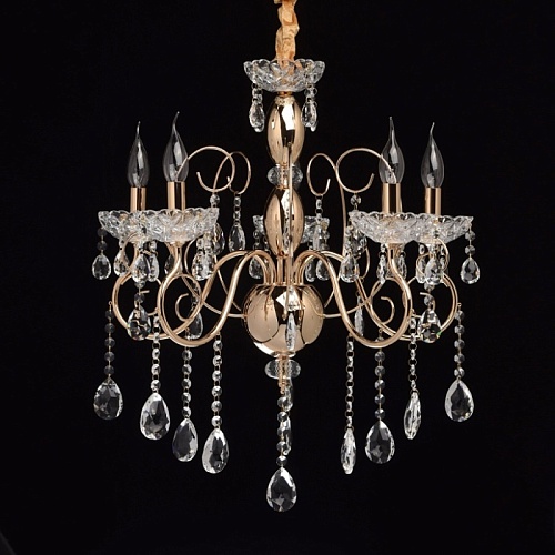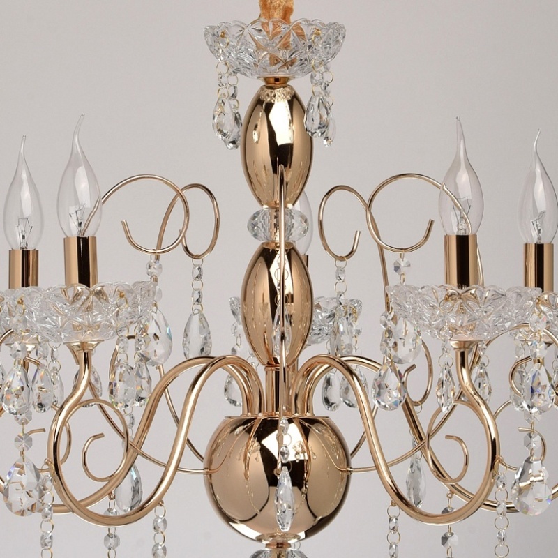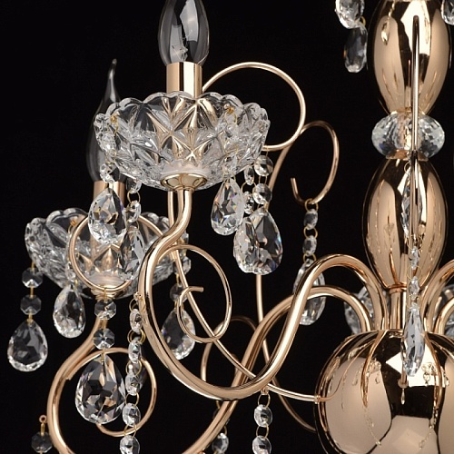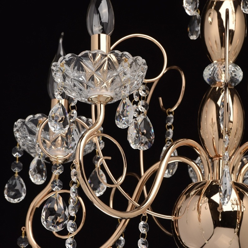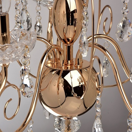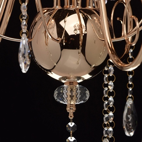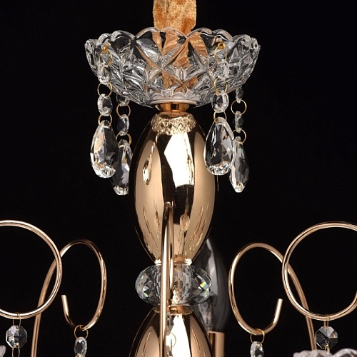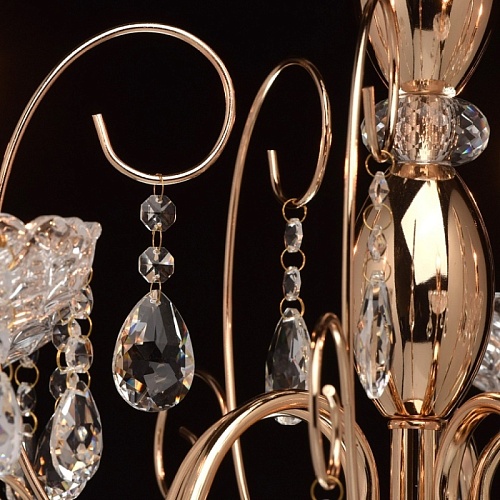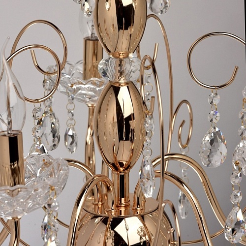 Основание: металл, гальванизировано в цвет французского золота. Центральная ось декорирована элементами из стали, выполненными по технологии токарной обработки и массивами хрусталя со сложной огранкой. Декоративные розетки выполнены из стекла, отлитого в сложную форму. Светильник декорирован подвесками из хрусталя высокого качества, формы октагон и миндаль.