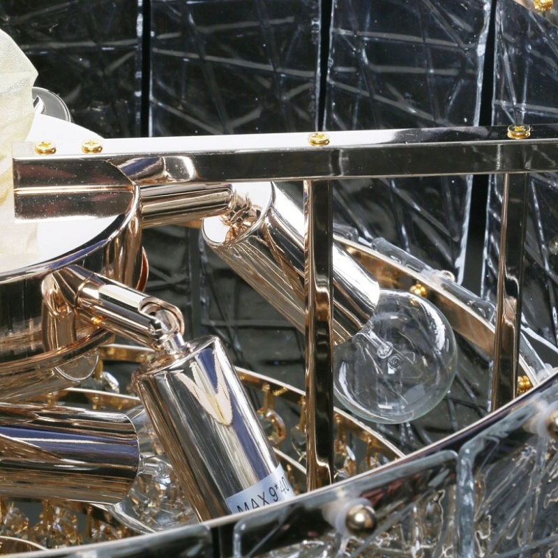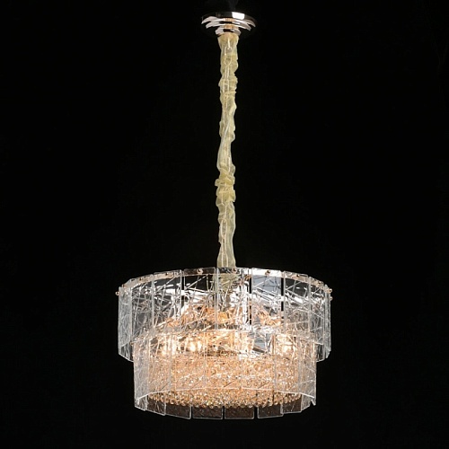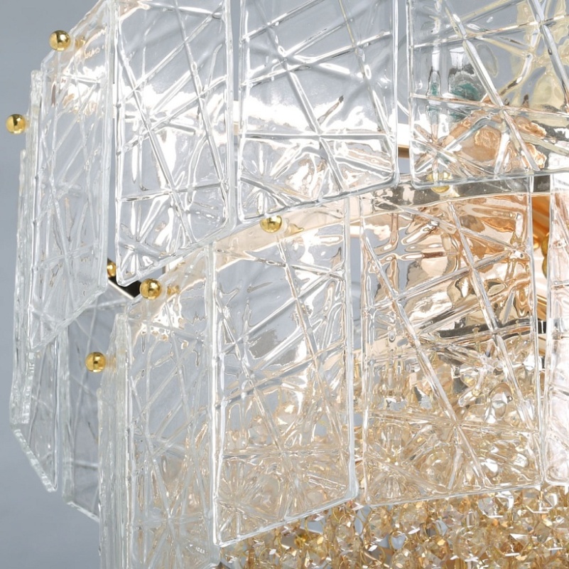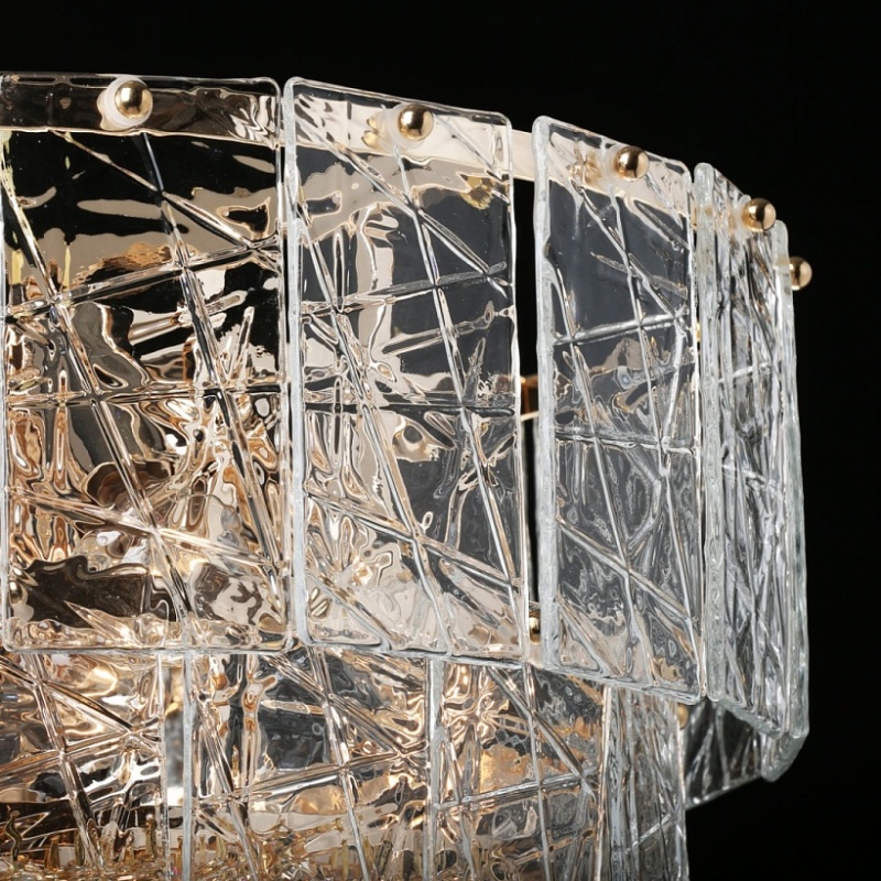 Основание светильника выполнено из металла и гальванизировано в цвет золота. Светильник декорирован оригинальным плафоном, состоящим из стеклянных прозрачных фактурных пластин и гальванизированным в цвет шампань хрусталем.