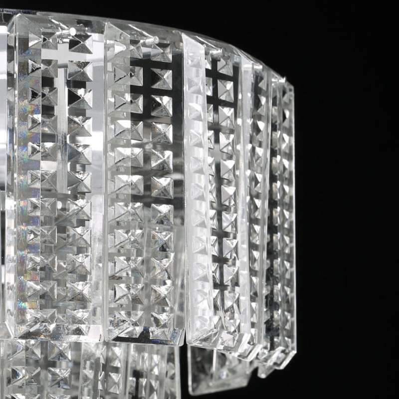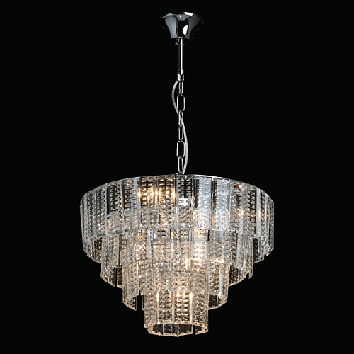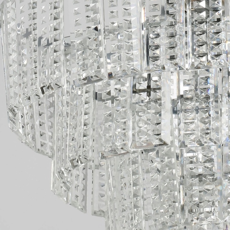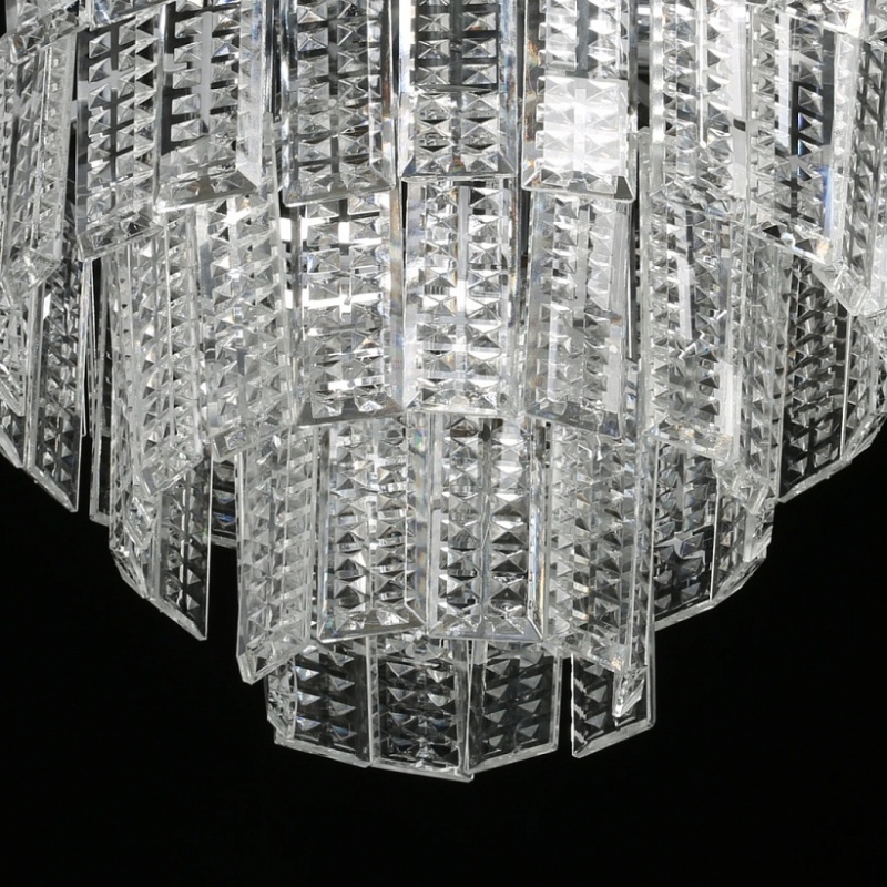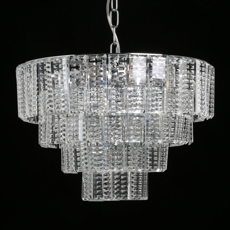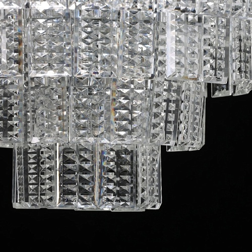 Металлическое основание подвесной люстры гальванизировано в цвет хрома. Люстра декорирована прозрачным фактурным хрусталем прямоугольной формы.