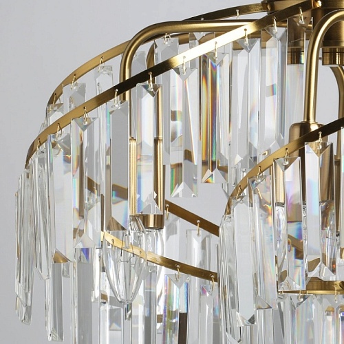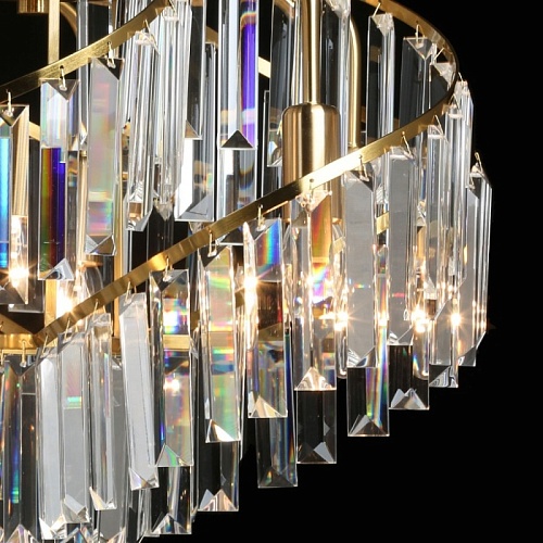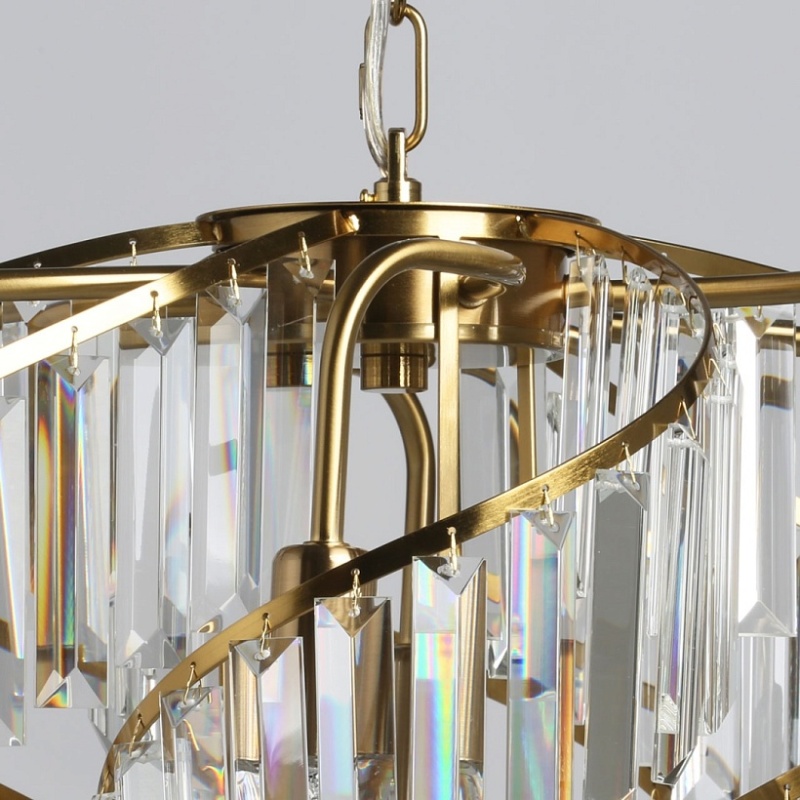 Металлическое основание светильника гальванизировано в цвет золота. Светильник декорирован прозрачным хрусталем вытянутой формы.