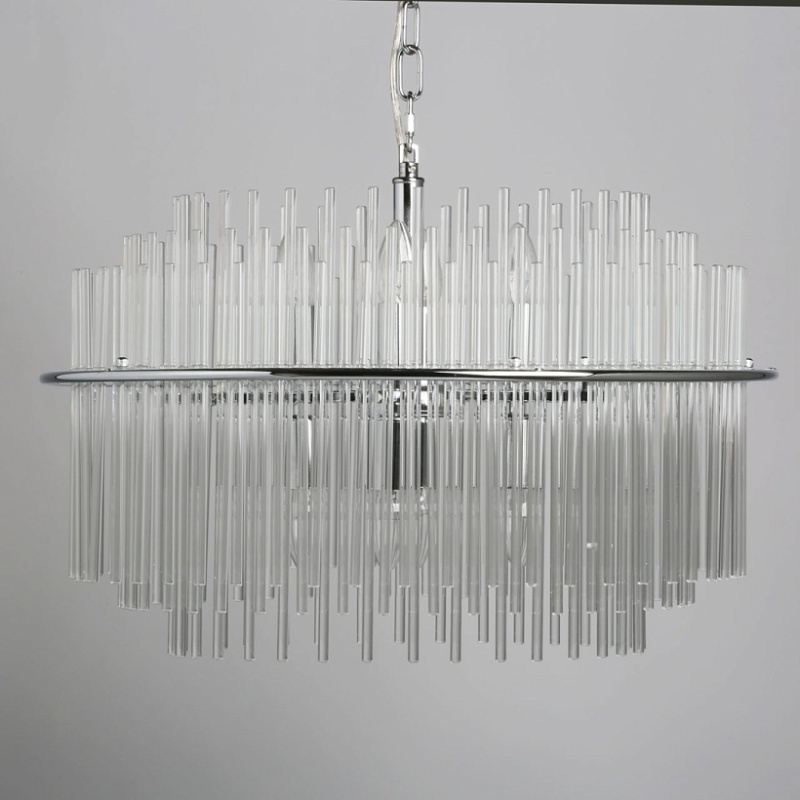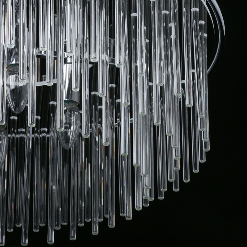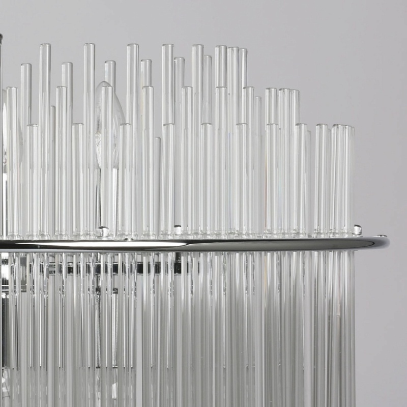 Металлическое основание светильника гальванизировано в цвет хрома. Светильник декорирован прозрачным стеклом в виде трубочек. Стеклянный декор крепится на пластину из нержавеющей стали, отполированной до зеркального блеска.