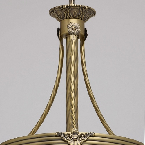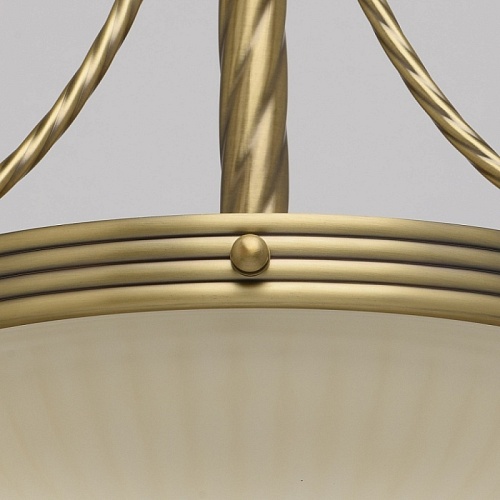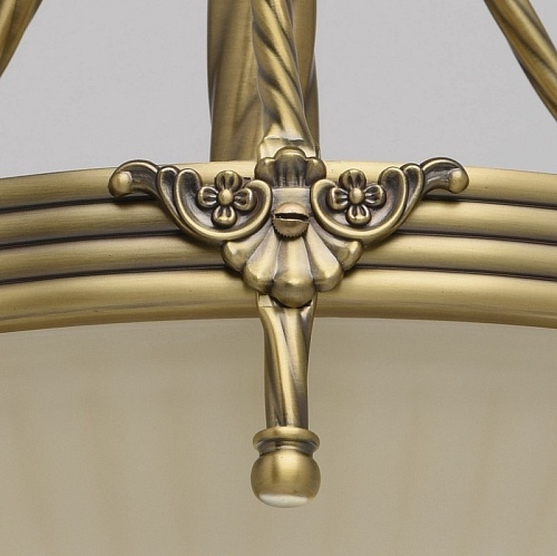 Арматура светильника выполнена из комбинации сплава железа и сплава алюминия и гальванизирована в цвет античной бронзы с эффектом патинирования. Основание, центральная ось и каркас плафона выполнены из сплава железа. Декоративные элементы изготовлены по технологии твист. Плафон изготовлен из стекла, окрашенного в массе в цвет ванили, отлит по форме и матирован. Плафон декорирован художественным литьем из сплава алюминия.