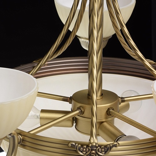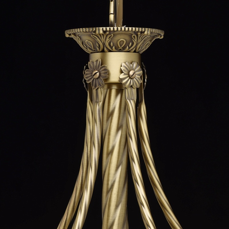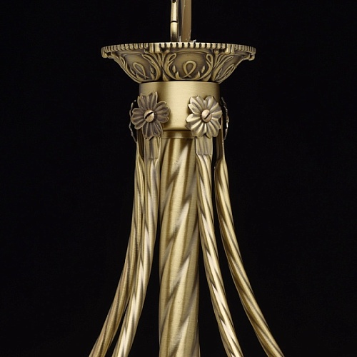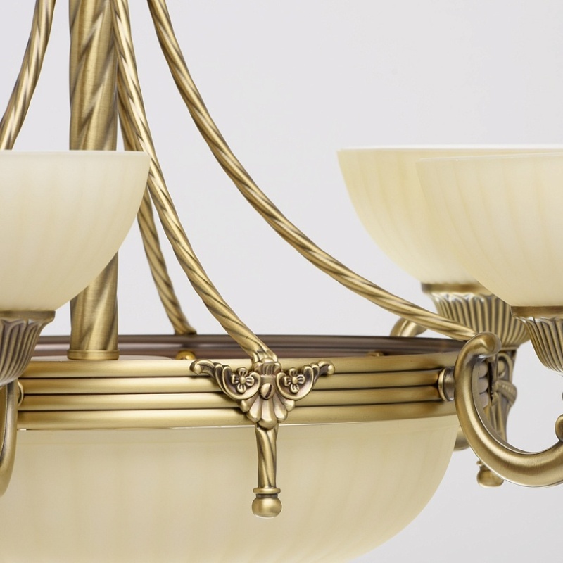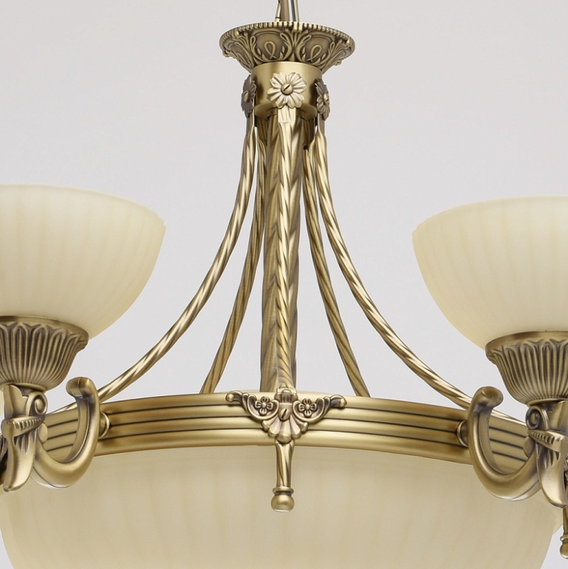 Арматура светильника выполнена из комбинации сплава железа и сплава алюминия и гальванизирована в цвет античной бронзы с эффектом патинирования. Основание, центральная ось и каркас плафона выполнены из сплава железа. Декоративные элементы изготовлены по технологии твист. Рожки изготовлены из сплава алюминия по технологии художественного литья. Плафоны изготовлены из стекла, окрашенного в массе в цвет ванили, отлиты в сложную форму и матированы. Центральный плафон декорирован художественным литьем из сплава алюминия.