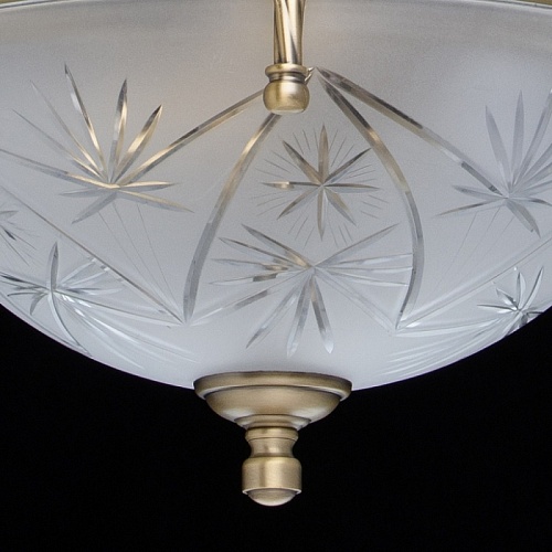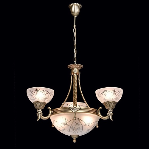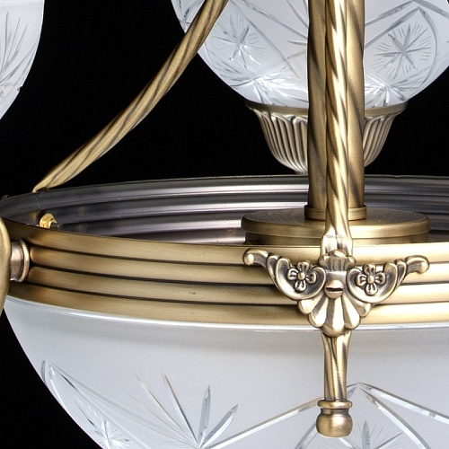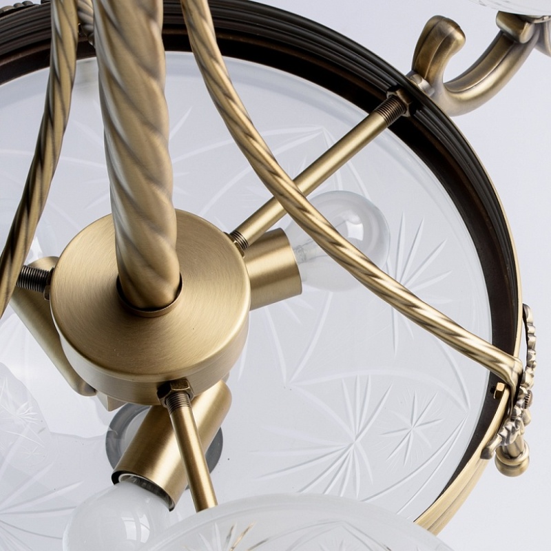 Арматура светильника выполнена из комбинации сплава железа и сплава алюминия и гальванизирована в цвет античной бронзы с эффектом патинирования. Основание, центральная ось и каркас плафона выполнены из сплава железа. Декоративные элементы изготовлены по технологии твист. Рожки изготовлены из сплава алюминия по технологии художественного литья. Плафоны изготовлены из прозрачного стекла , обработанного пескоструйным матированием с рисунком нанесенным по технологии алмазной резьбы. Центральный плафон декорирован художественным литьем из сплава алюминия.