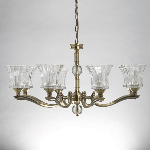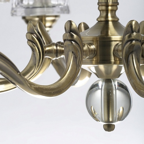 Основание светильника выполнено из комбинации сплавов металлов и гальванизировано в цвет античной бронзы. Рожки выполнены по технологии художественного литья из сплава алюминия. Светильник декорирован прозрачными стеклянными плафонами, отлитыми в сложную форму. Центральная ось декорирована сферами из прозрачного акрила.