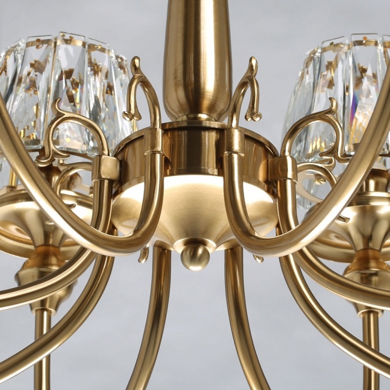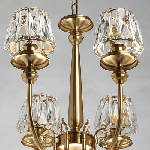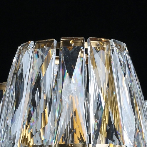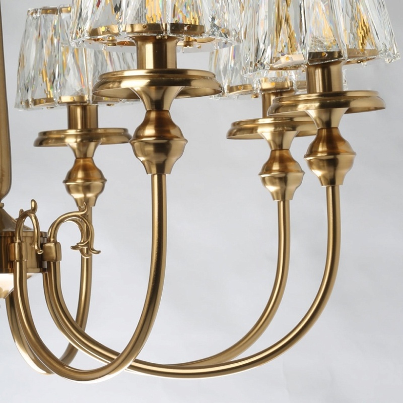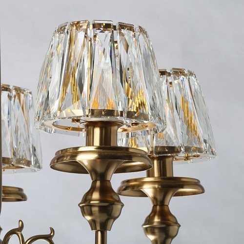 Металлическое основание светильника гальванизировано в цвет бронзы. Рожки декорированы изящными элементами художественного литья из сплава алюминия с цинком. Светильник декорирован плафонами из прозрачного хрусталя прямоугольной формы со множественными центрами схождения граней.
