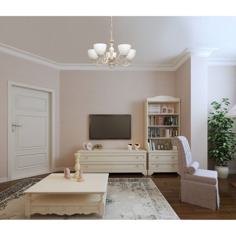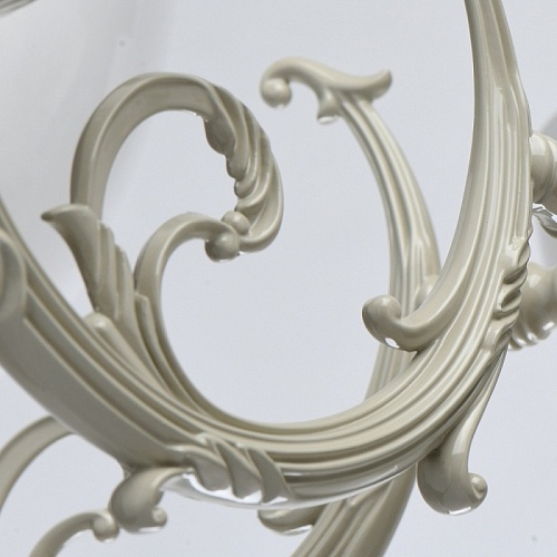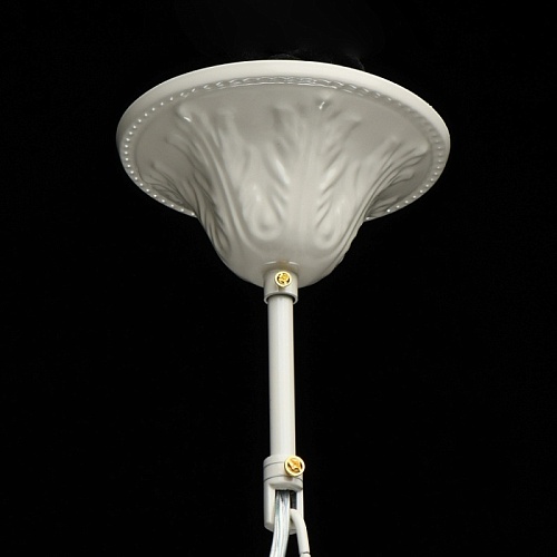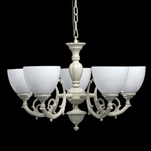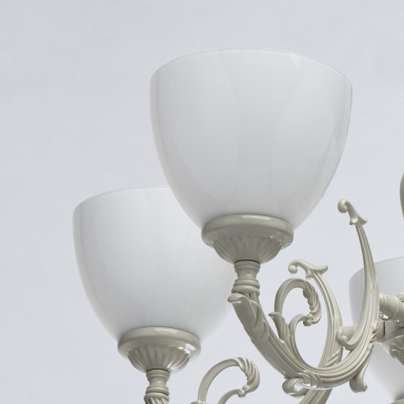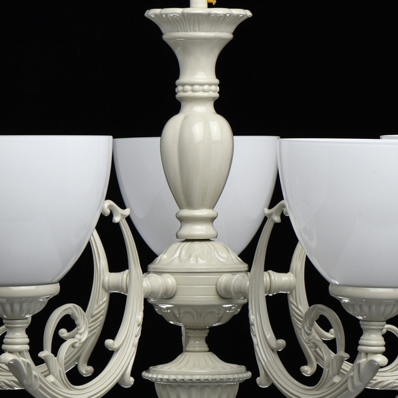 Основание светильника выполнено из комбинации сплавов металла.Основание светильника окрашено в цвет слоновой кости.Центральный стержень: применена система двойного окрашивания.Потолочная чаша, корпус, заверсша, декоративные розетки: металл, прессование.Центральный стержень, рожки и декоративная гайка изготовлены из сплава алюминия по технологии художественного литья.Плафоны: стекло, окрашенное в массе в белый цвет.
