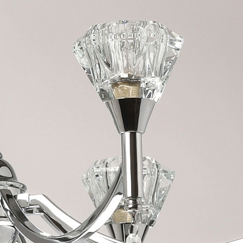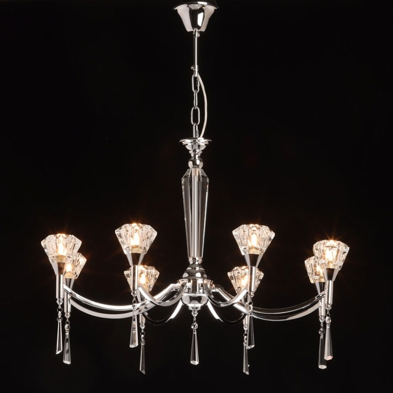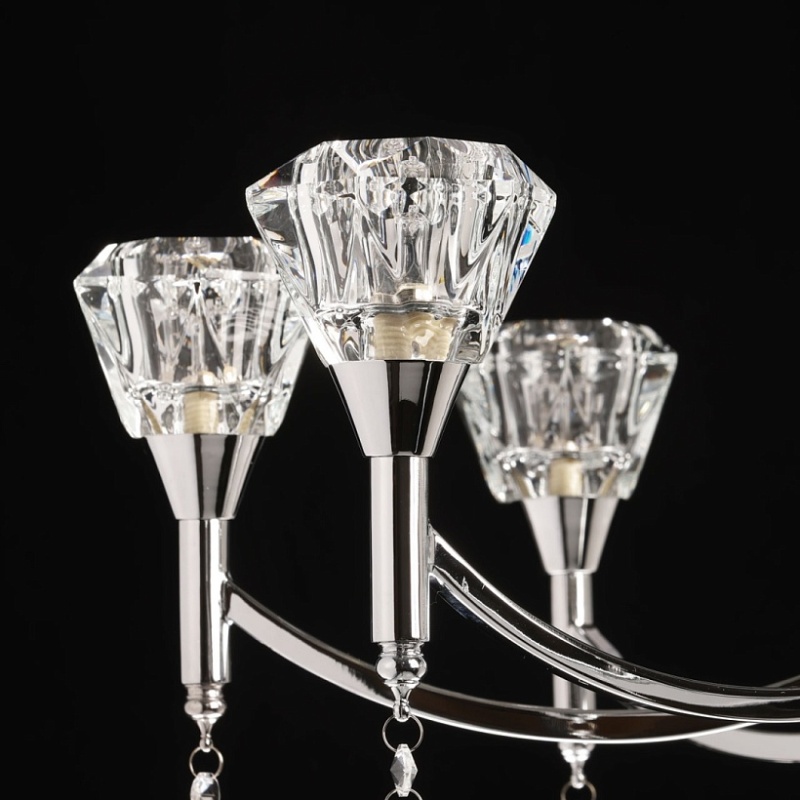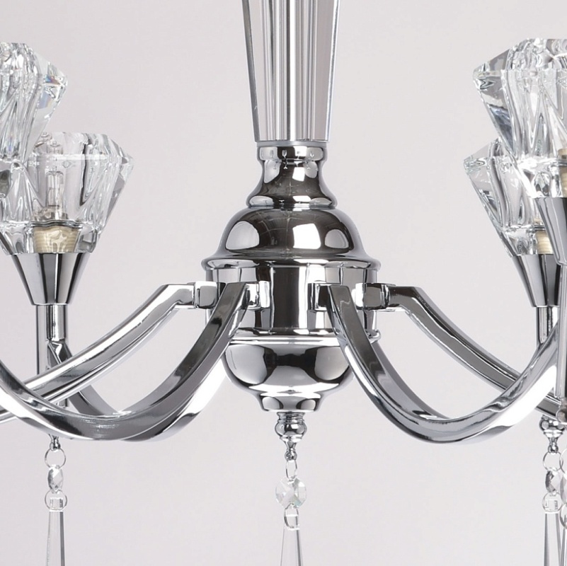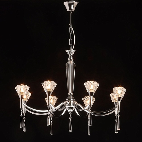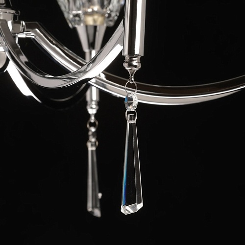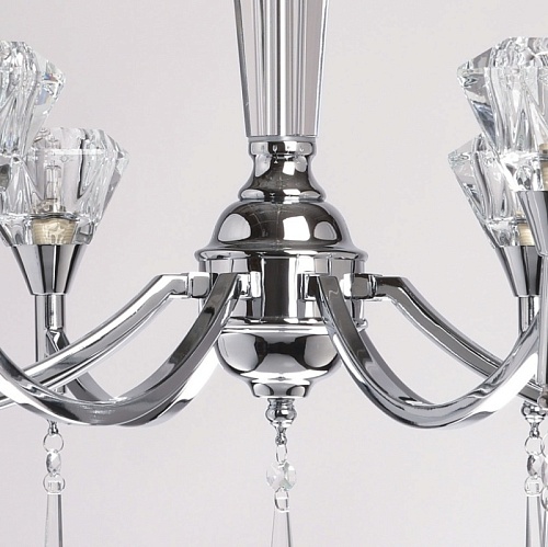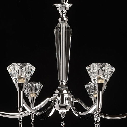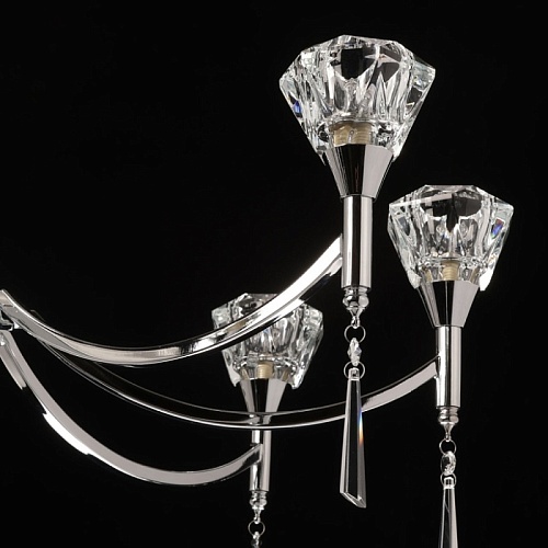 Металлическое основание светильника гальванизировано в цвет хрома. Плафоны и декор центральной оси выполнены из прозрачного массива хрусталя. Светильник декорирован хрустальными подвесками вытянутой формы.