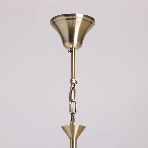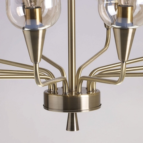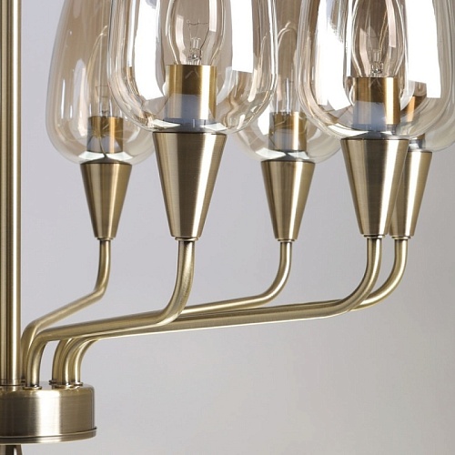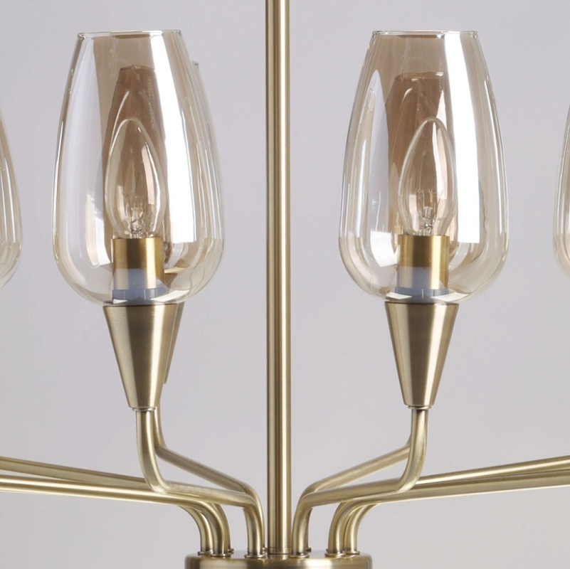 Металлическое основание подвесной люстры гальванизировано в цвет латуни. Светильник декорирован выдувными вручную стеклянными плафонами, гальванизированными в цвет шампань.