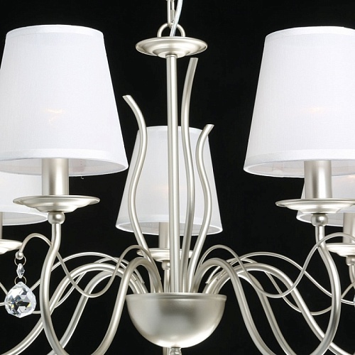 Металлическое основание подвесного светильника окрашено в цвет перламутрового золота. Двухслойные абажуры белого цвета выполнены из текстиля и прозрачного термостойкого акрила. Светильник декорирован прозрачным хрусталем в форме шара.