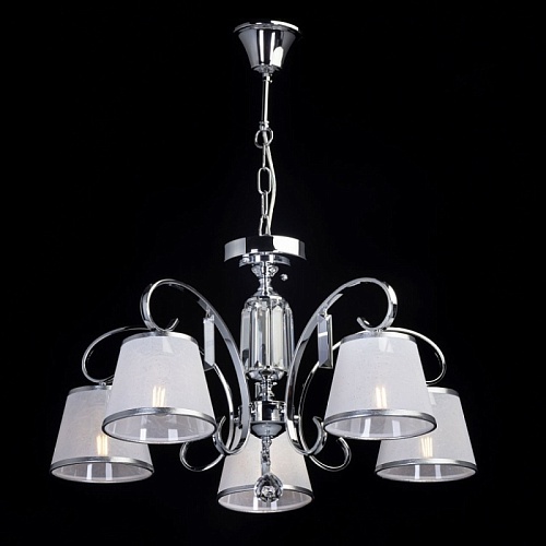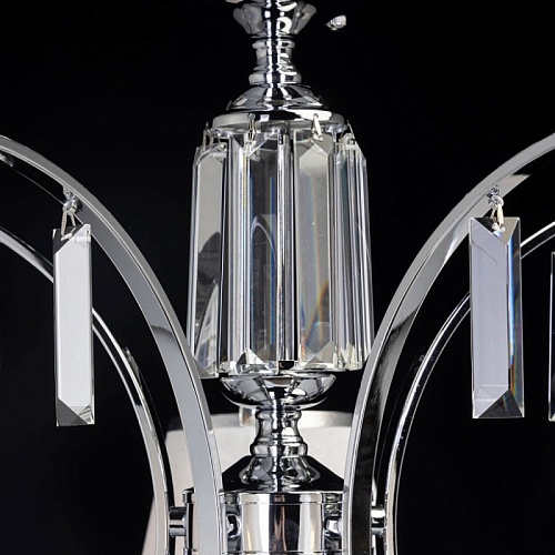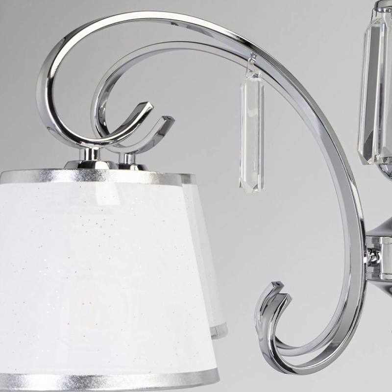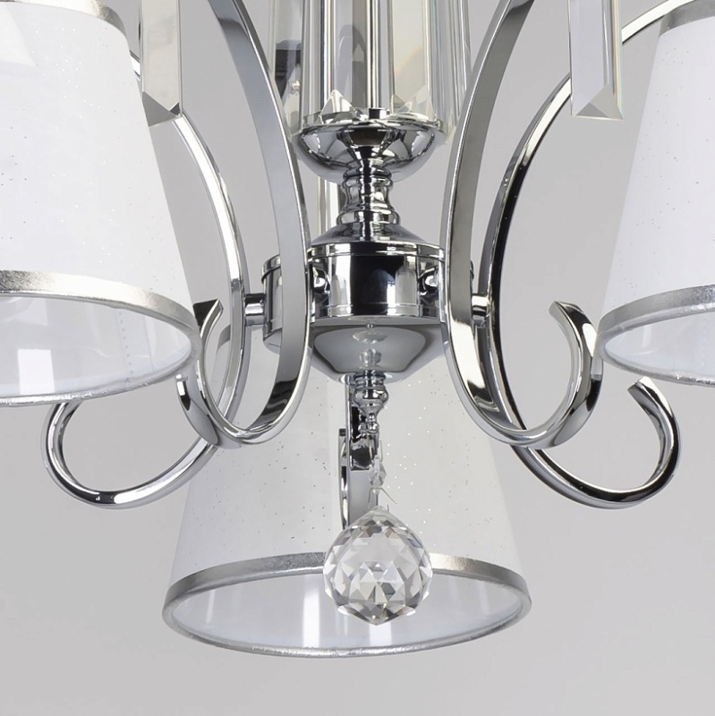 Металлическое основание подвесной люстры гальванизировано в цвет хрома. Двухслойные текстильные абажуры белого цвета отделаны кантом серебряного цвета. Люстра декорирована прозрачным хрусталем прямоугольной формы и формы шара.
