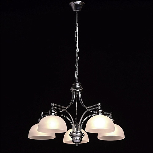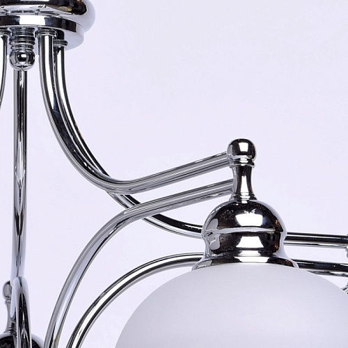 Арматура светильника выполнена из сплава железа и гальванизирована в цвет хрома. Плафоны выполнены из стекла, обработанного по технологии с пескоструйного матирования. Оригинальная конструктивная особенность светильника - отсутствие центральной оси.