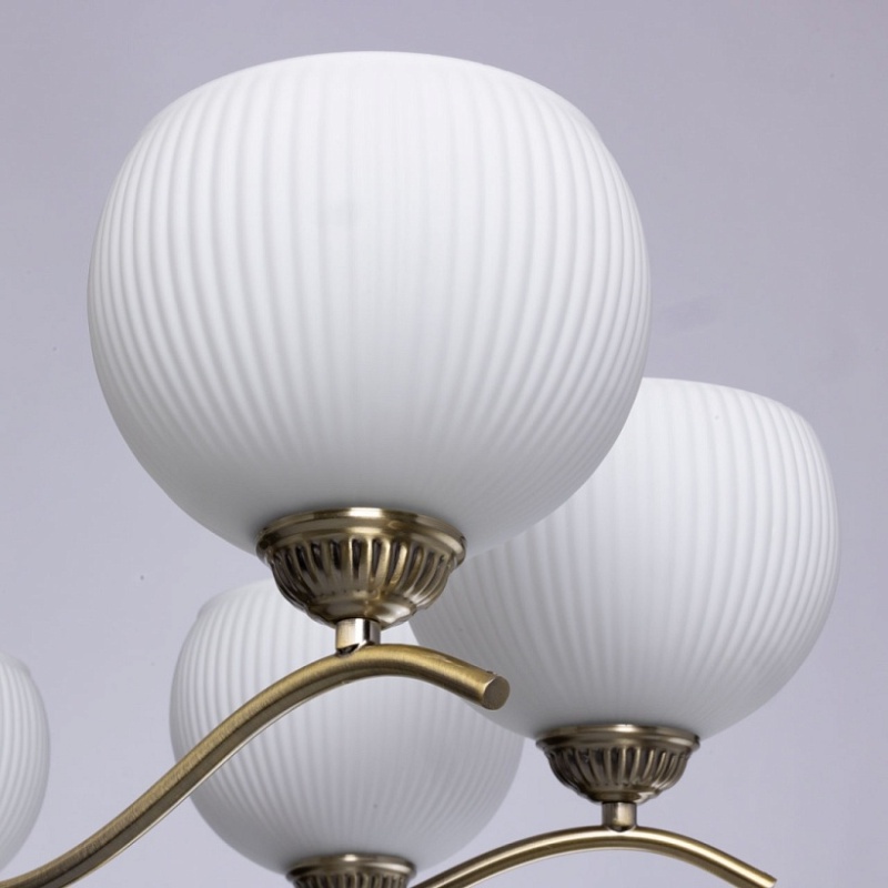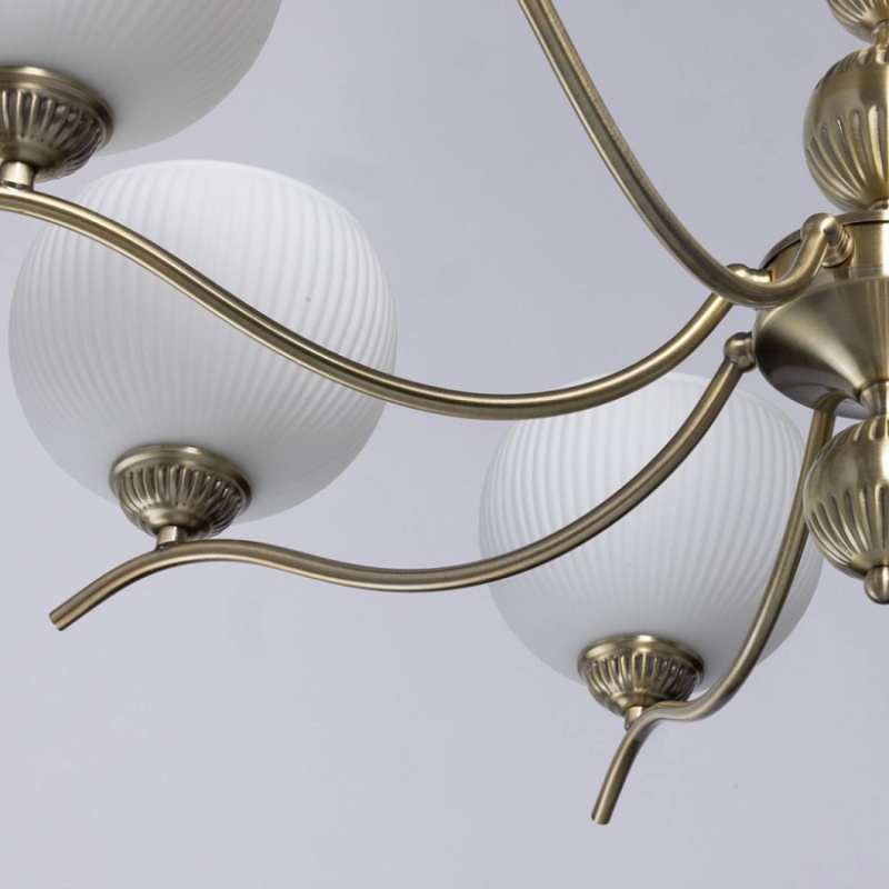 Металлическое основание подвесной люстры гальванизировано в цвет античной бронзы. Светильник декорирован стеклянными плафонами, отлитыми в сложную форму и окрашенными в белый цвет изнутри.