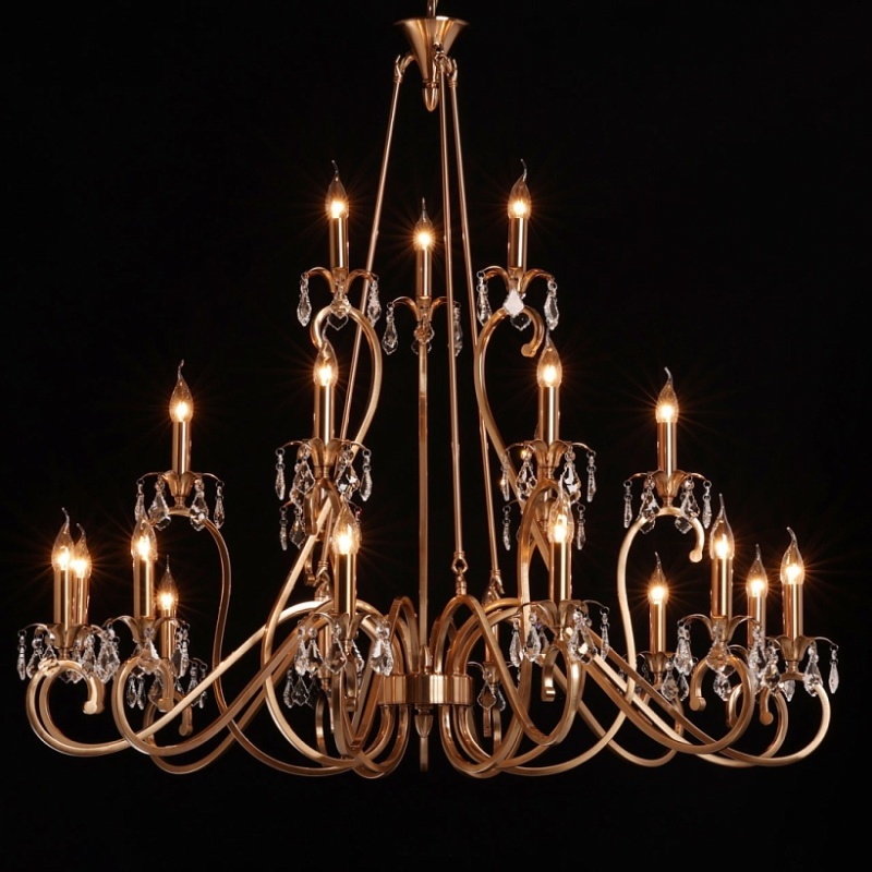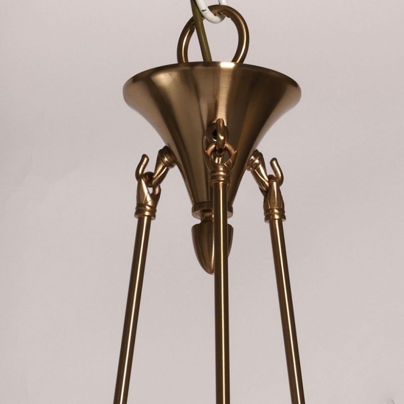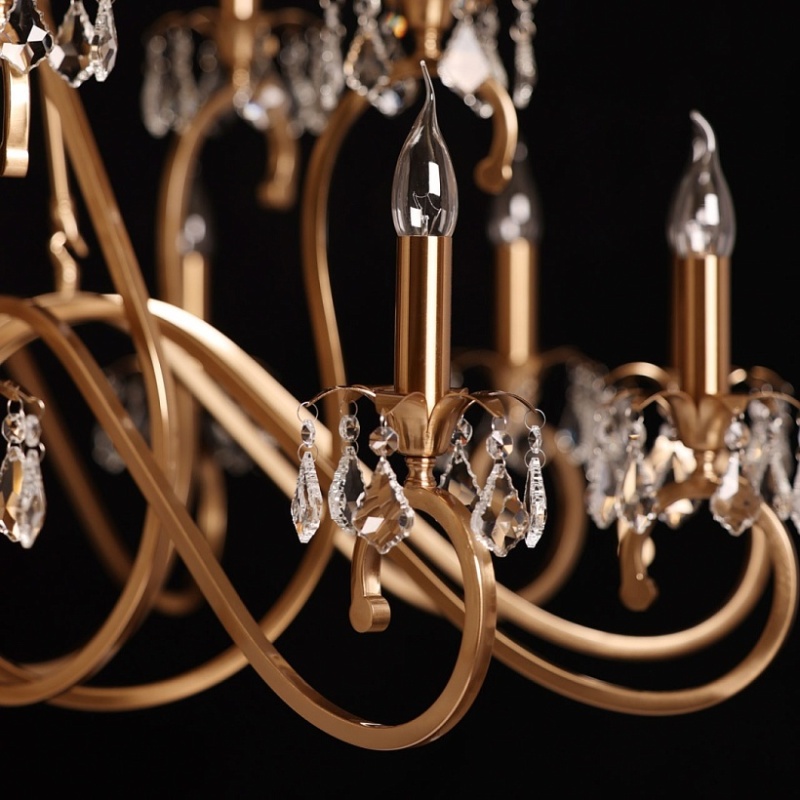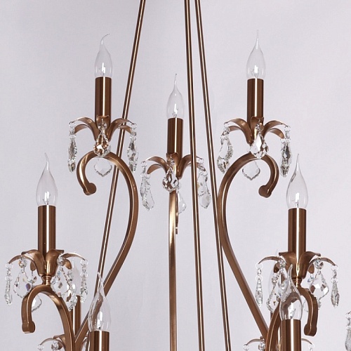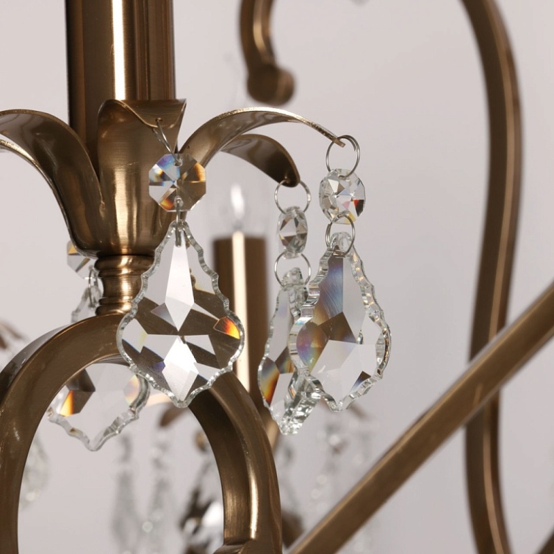 Металлическое основание подвесной люстры гальванизировано в цвет античной бронзы. Светильник декорирован прозрачным хрусталем формы дубовый лист.