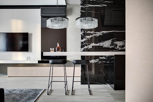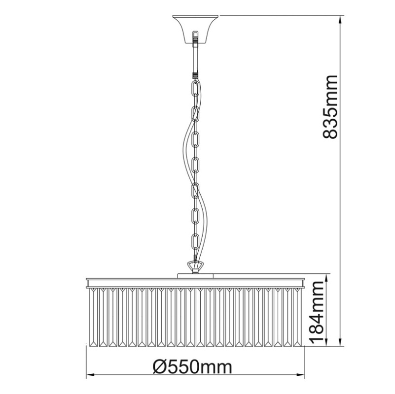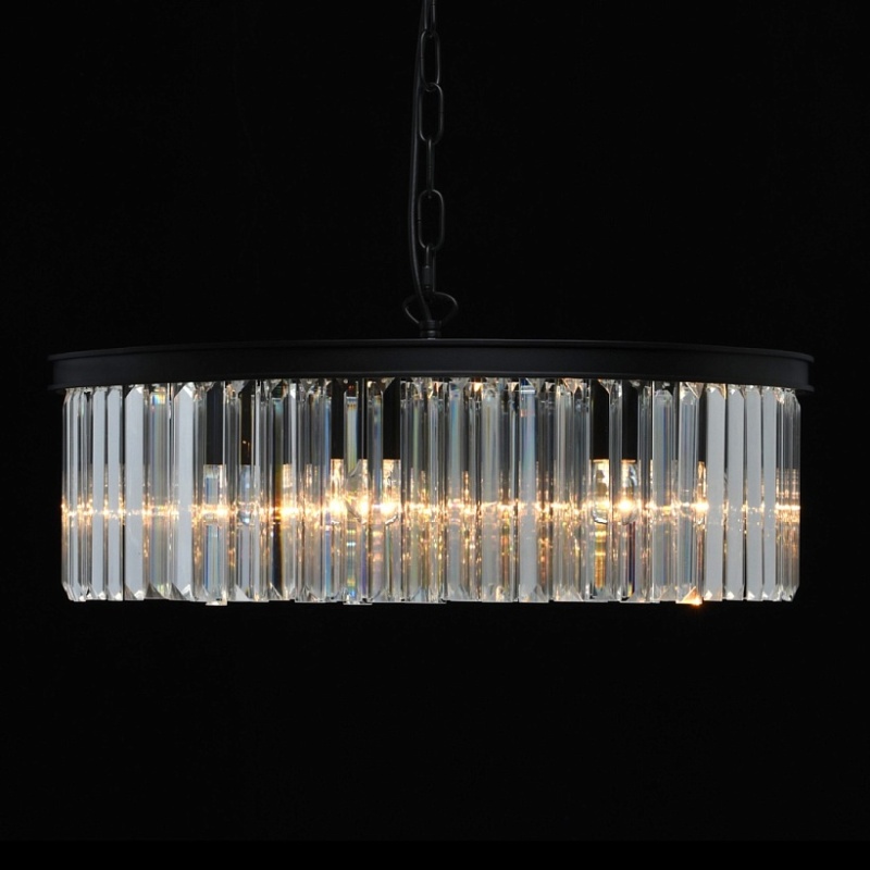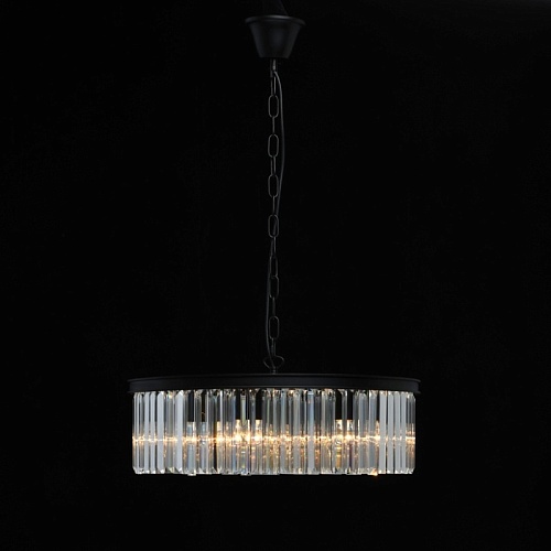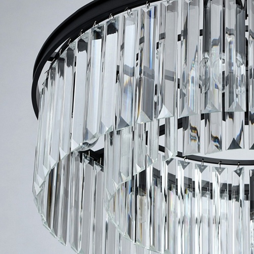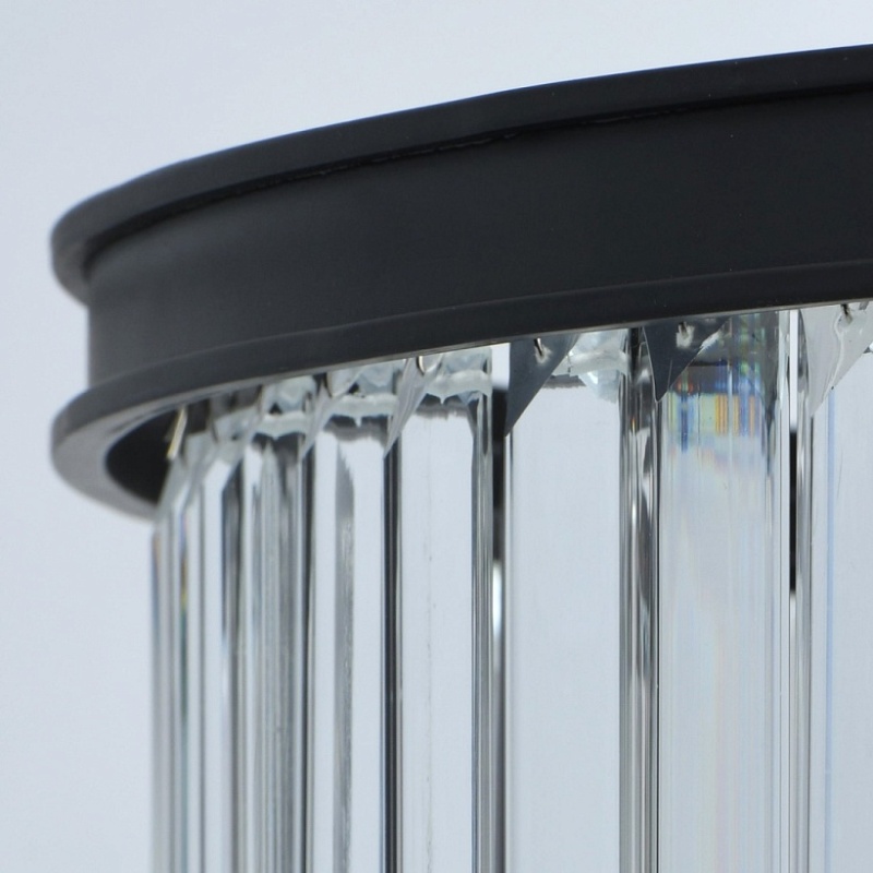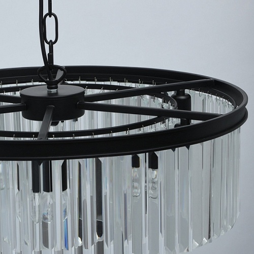 Основание выполнено из металла и окрашено в черный матовый цвет. Декоративные подвески из прозрачного хрусталя прямоугольной формы.
