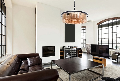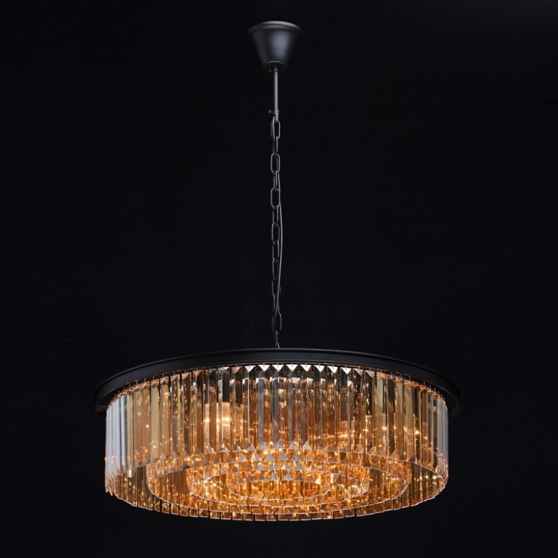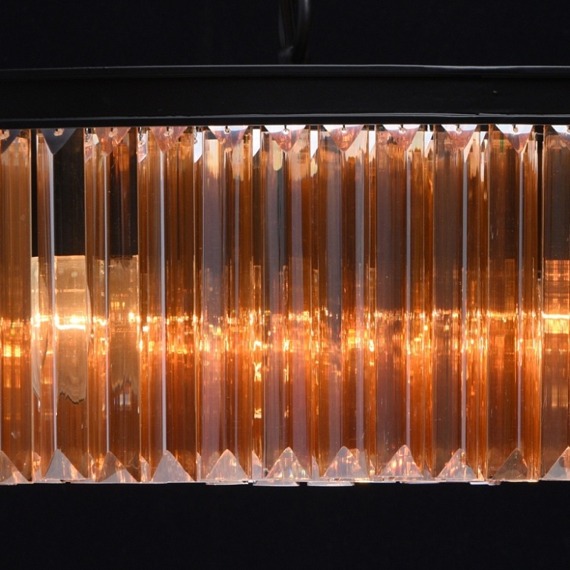 Основание выполнено из металла и окрашено в черный матовый цвет. Декоративные подвески из хрусталя прямоугольной формы, гальванизированного в цвет топаза.