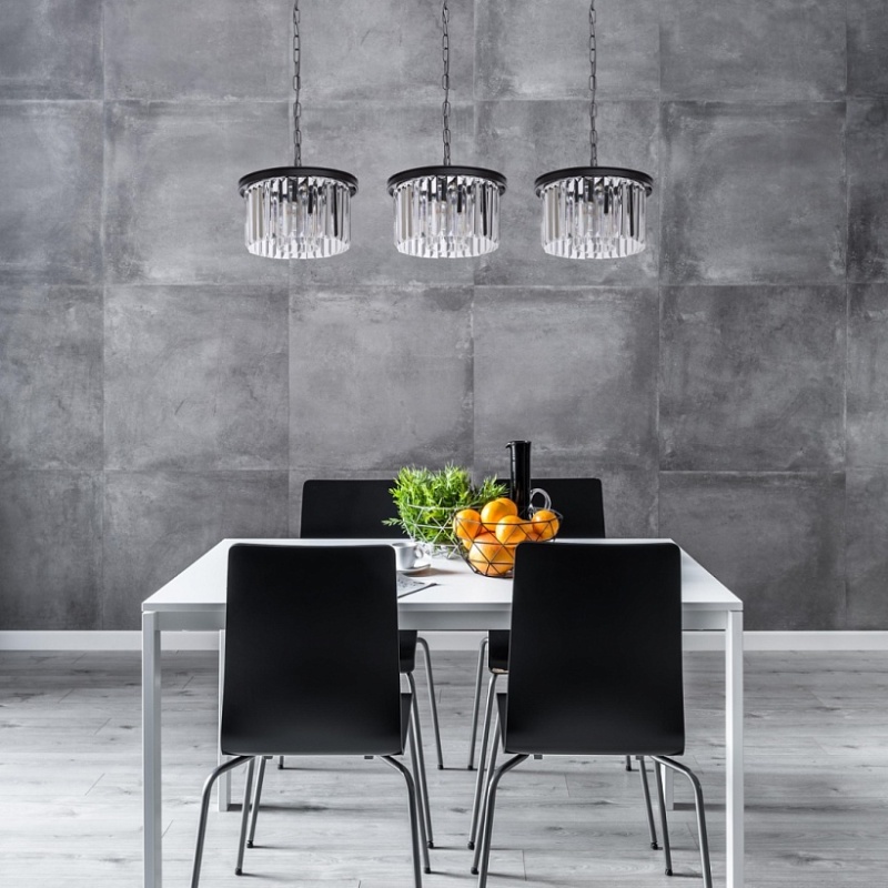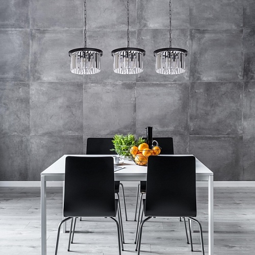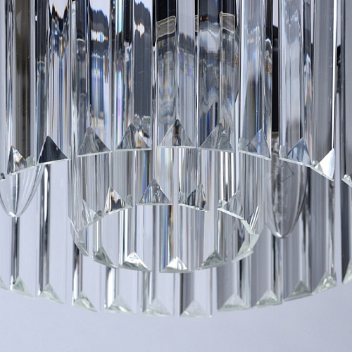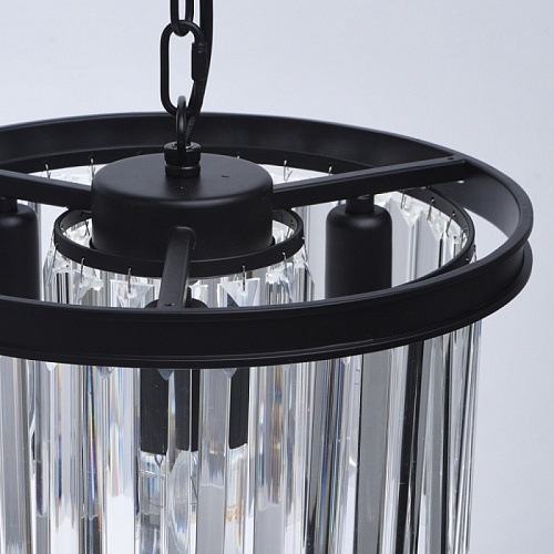 Основание светильника выполнено из металла и окрашено в черный матовый цвет. Светильник декорирован прозрачным хрусталем прямоугольной формы.