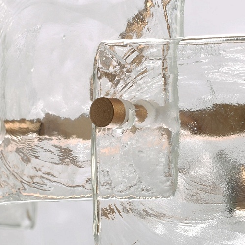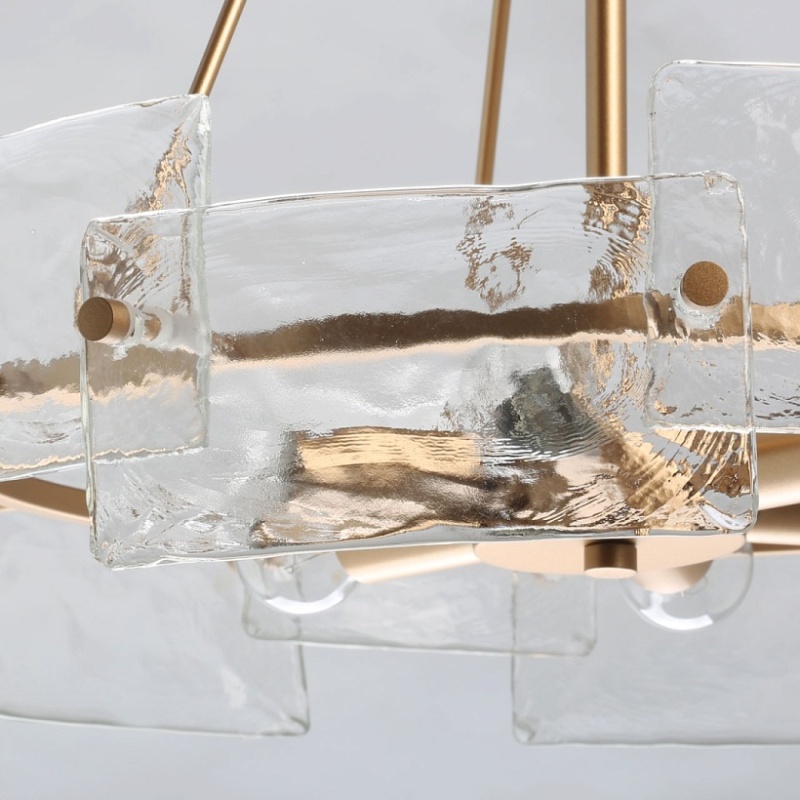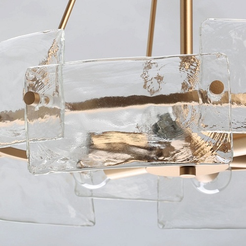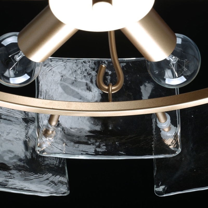 Металлическое основание гальванизировано в цвет золота. Подвесная люстра декорирована фактурными стеклянными пластинами, имитирующими вулканическое стекло.