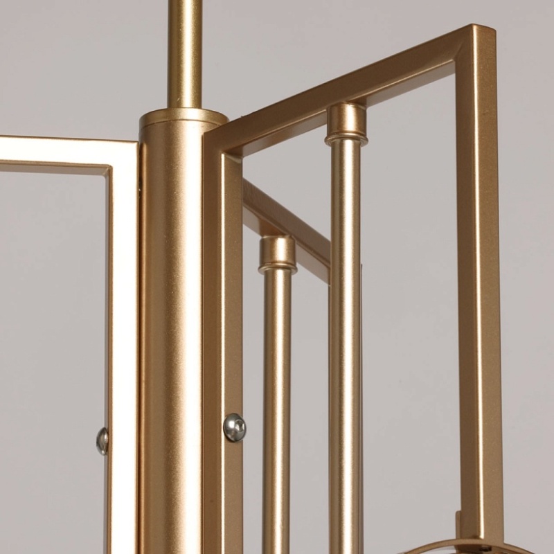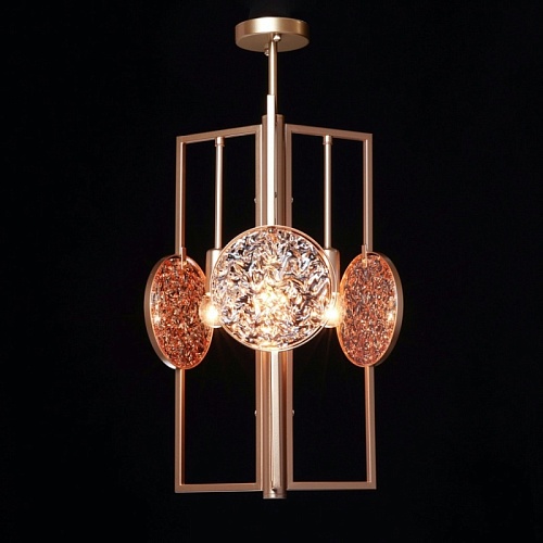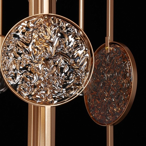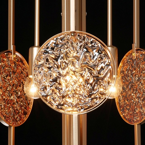 Металлическое основание подвесной люстры окрашено в цвет перламутрового золота. Декор выполнен из фактурного стекла, гальванизированного в цвет янтаря.