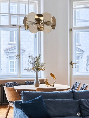 Металлическое основание подвесной люстры гальванизировано в цвет латуни. Светильник декорирован стеклянными элементами в форме круга, гальванизированными в цвет шампань и металлическими кругами, гальванизированными в цвет основания.
