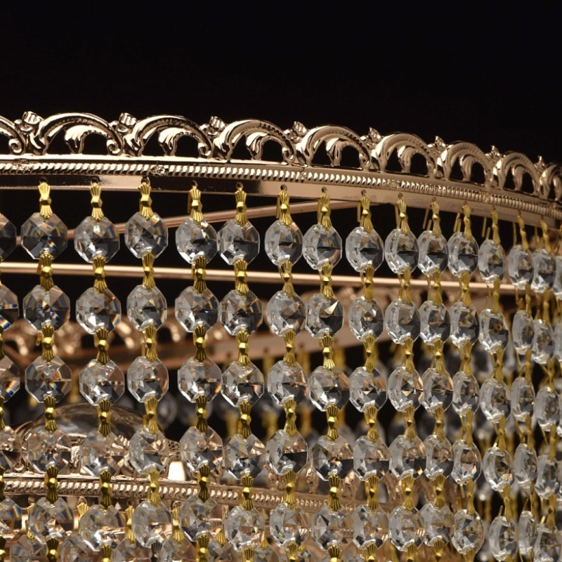 Основание: металл, гальванизация в цвет французского золота. Плафон: металлический каркас в цвет основания, декорирован подвесками прозрачного хрусталя формы октагона. Декор: чеканка на каркасе, папильоны в цвет арматуры.
