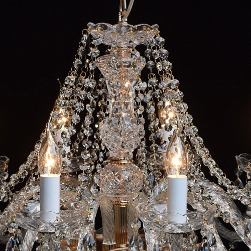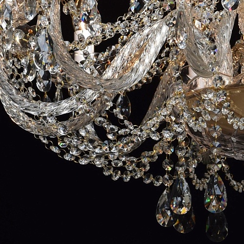 Арматура выполнена из сплава металла и гальванизирована в цвет французского золота. Рожки светильника выполнены из стекла гутным способом. Сверху арматура декорирована прозрачным хрустальным стеклом с градуированной огранкой. Светильник декорирован бусами из хрусталя и хрустальными подвесками 4-х видов огранки.