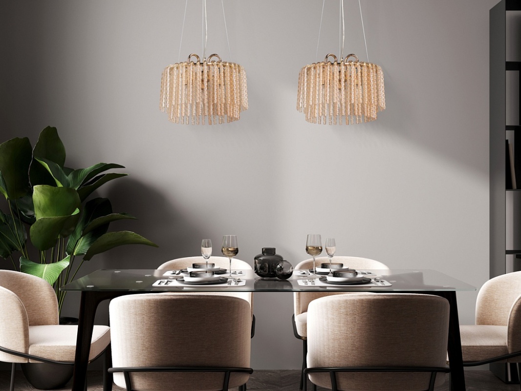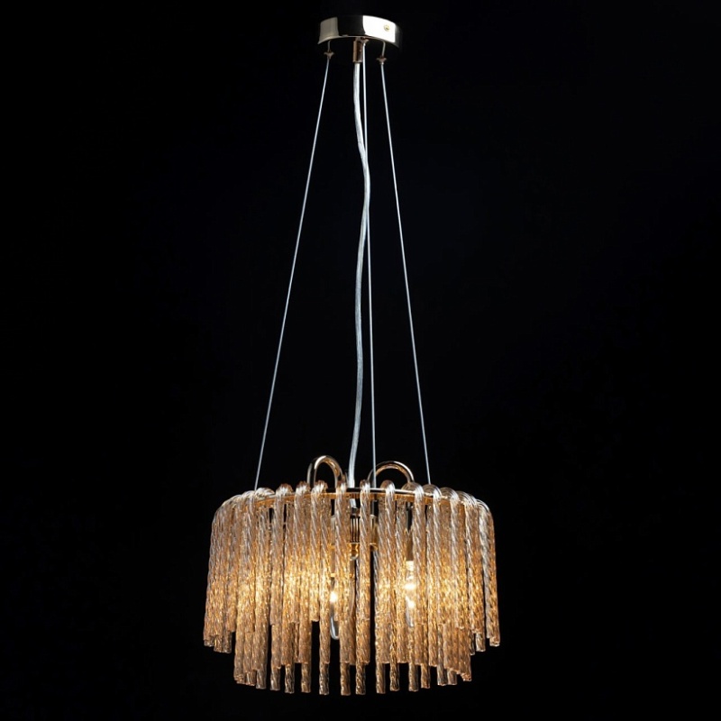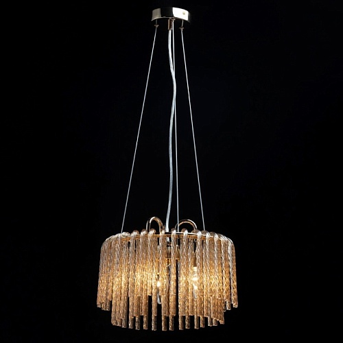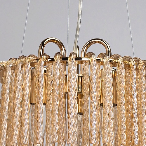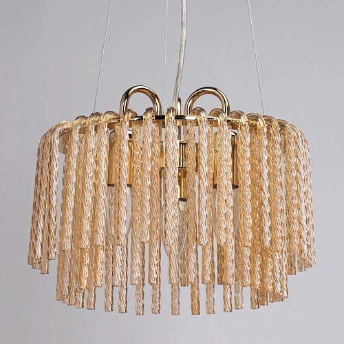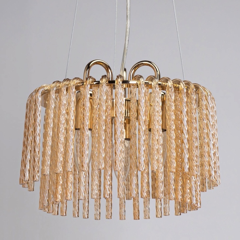Металлическое основание гальванизировано в цвет золота. Светильник декорирован стеклянными извитыми элементами, гальванизированными в цвет топаз.