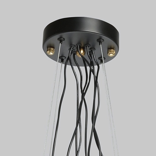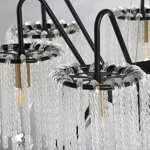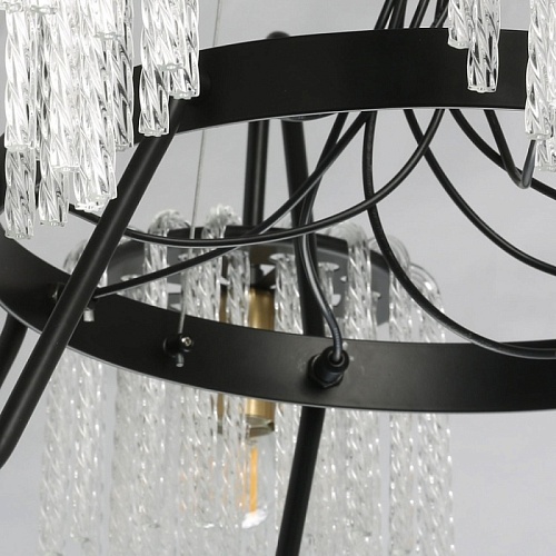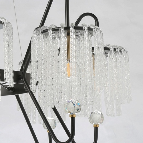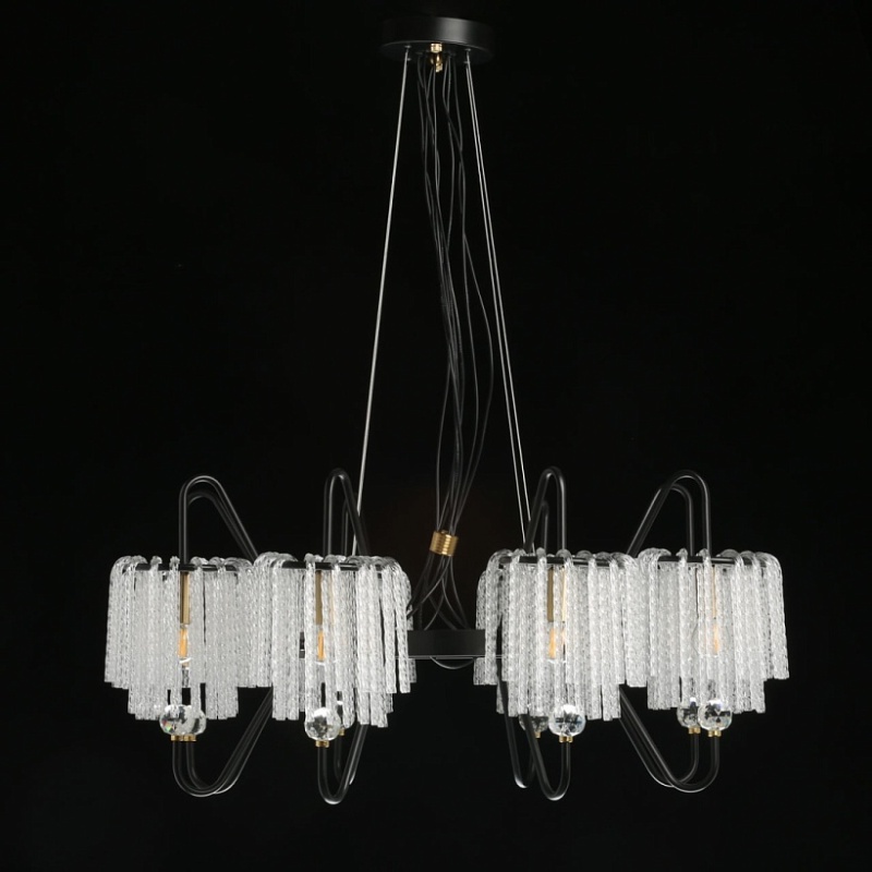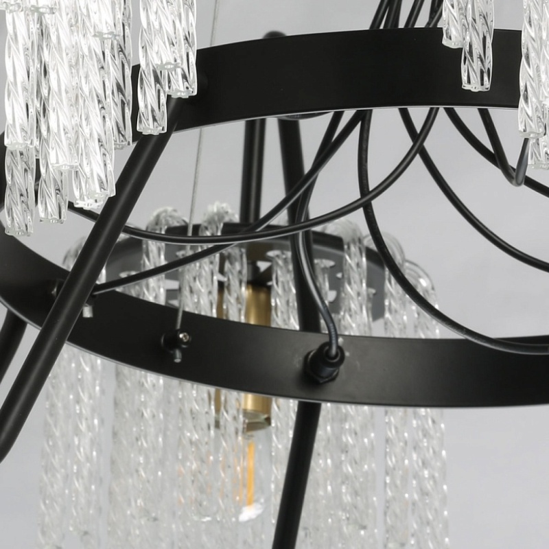 Металлическое основание окрашено в черный цвет. Отдельные элементы светильника гальванизированы в цвет бронзы. Светильник декорирован прозрачными стеклянными извитыми элементами.