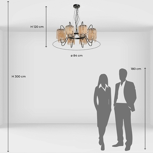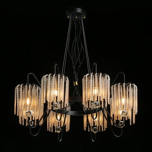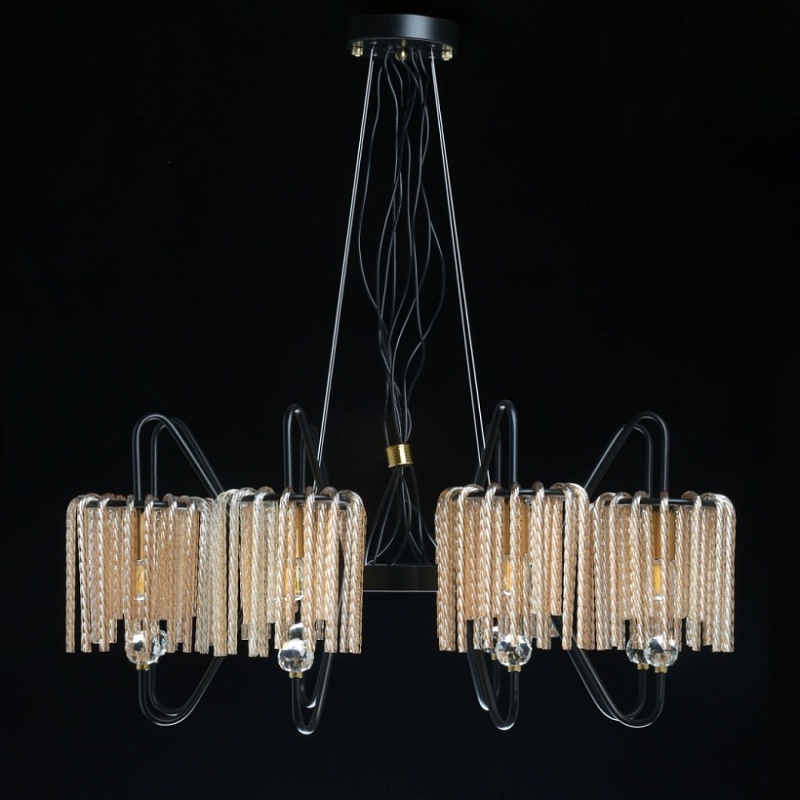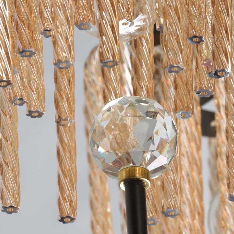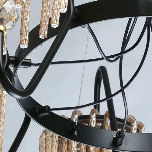 Металлическое основание окрашено в черный цвет. Отдельные элементы светильника гальванизированы в цвет бронзы. Светильник декорирован стеклянными извитыми элементами, гальванизированными в цвет топаз.