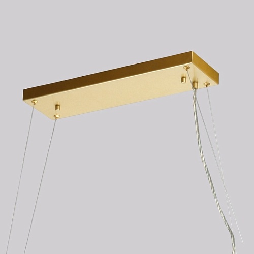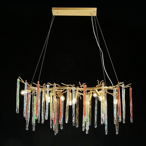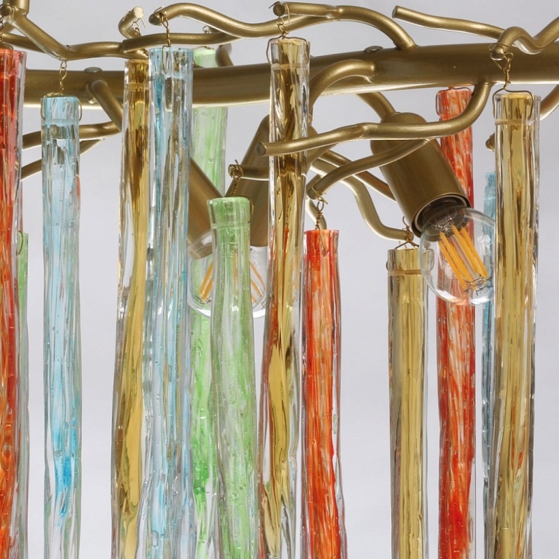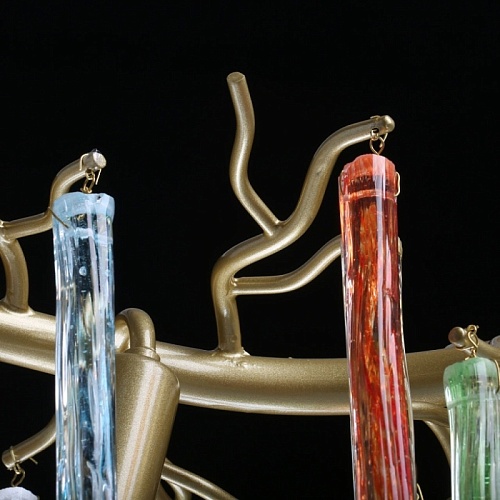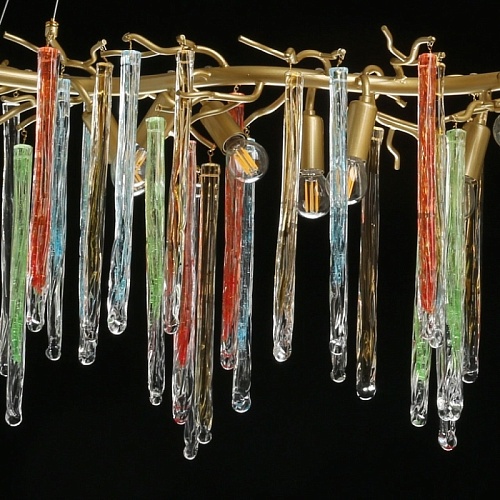 Металлическое основание светильника окрашено в цвет перламутрового золота. Люстра на тросах декорирована стеклянными элементами вытянутой формы, прозрачными и окрашенными в массе в красный, зеленый, голубой и желтый цвета.