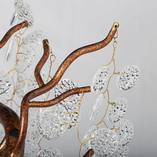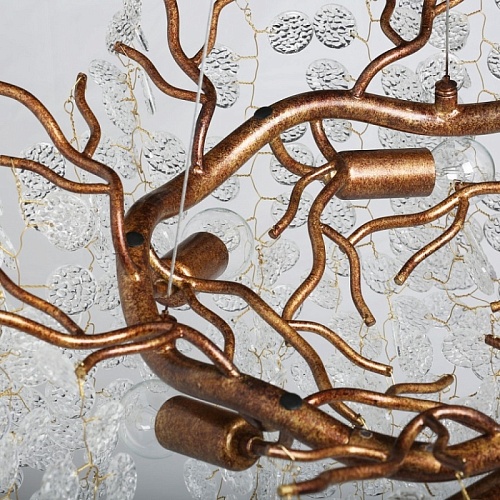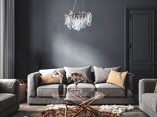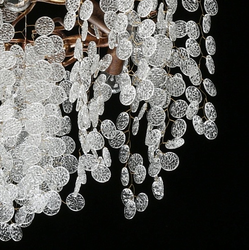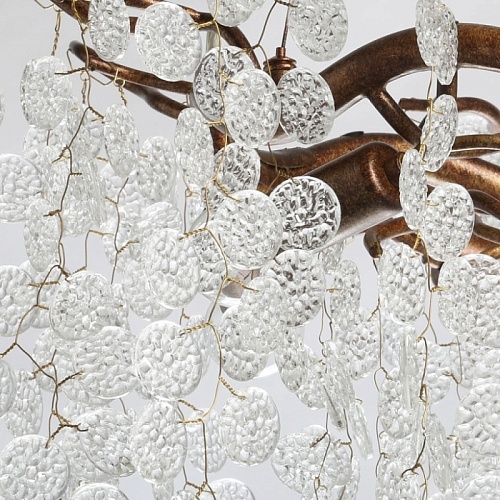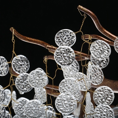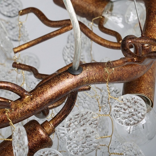 Металлическое основание гальванизировано в цвет античного золота. Люстра декорирована прозрачным фактурным стеклом круглой формы.