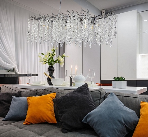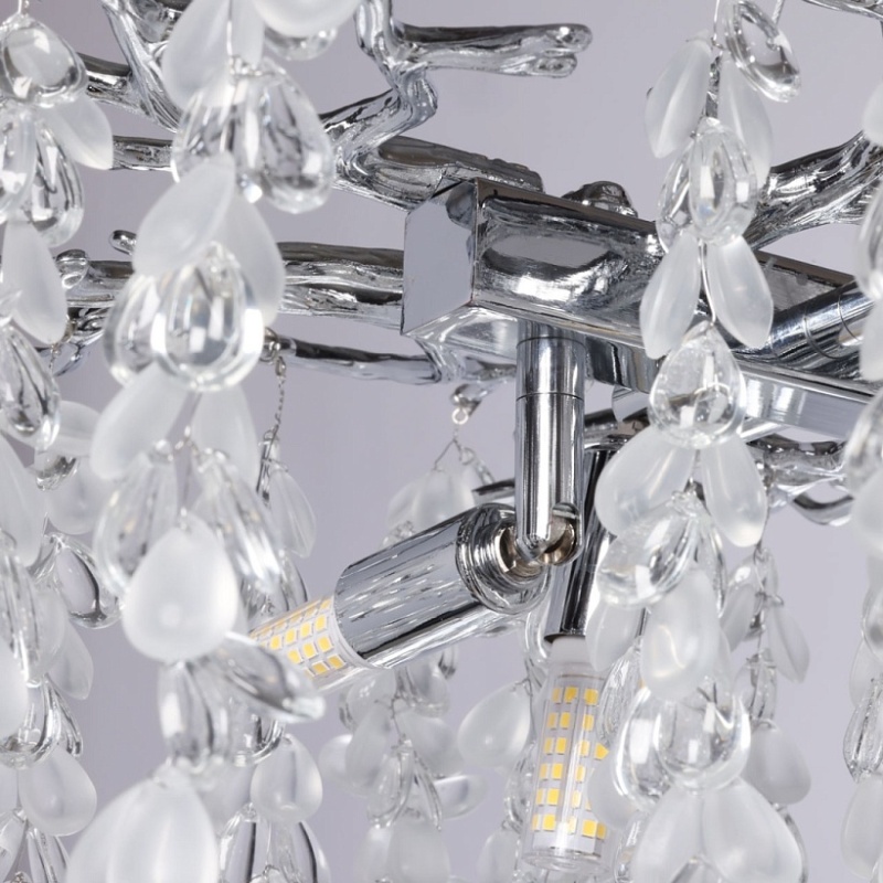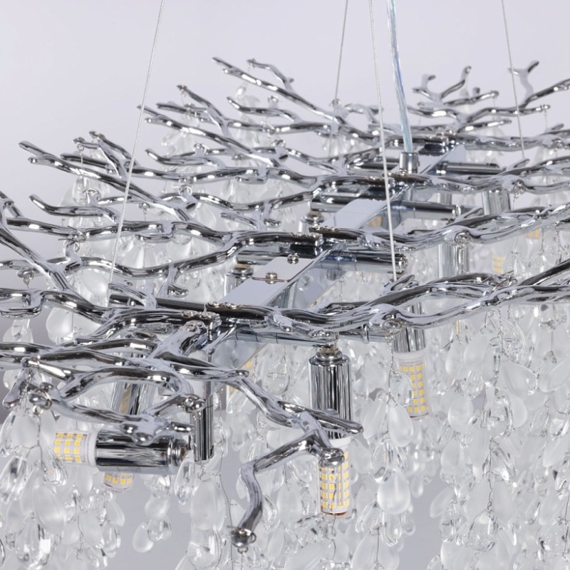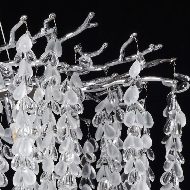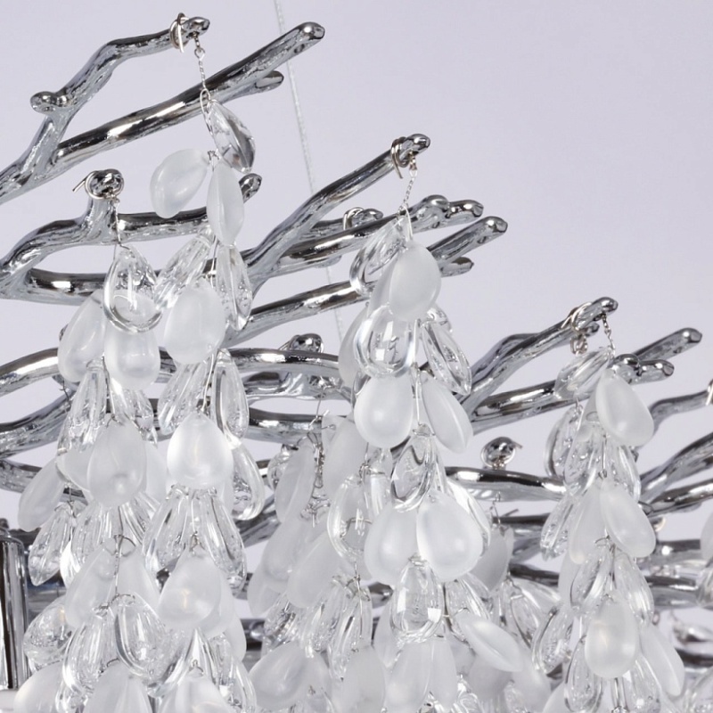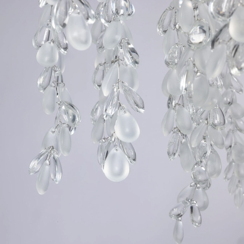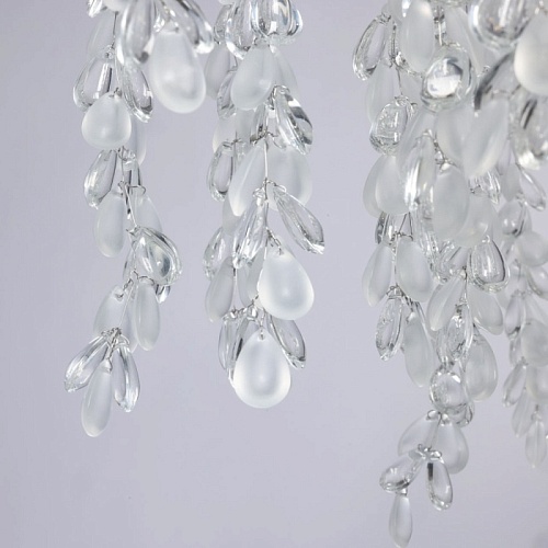 Основание подвесной люстры выполнено по технологии художественного литья из сплава алюминия с цинком и гальванизировано в цвет хрома. Люстра декорирована гроздьями из матового и прозрачного стекла.