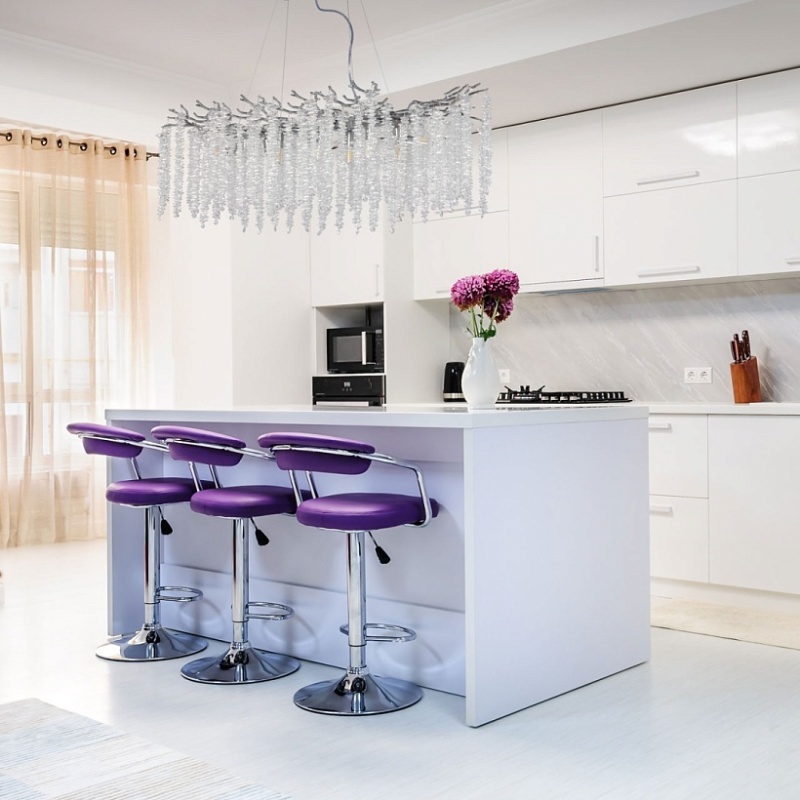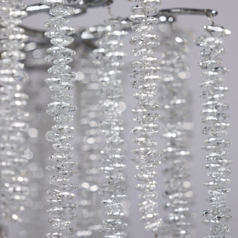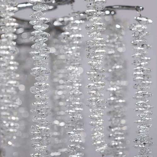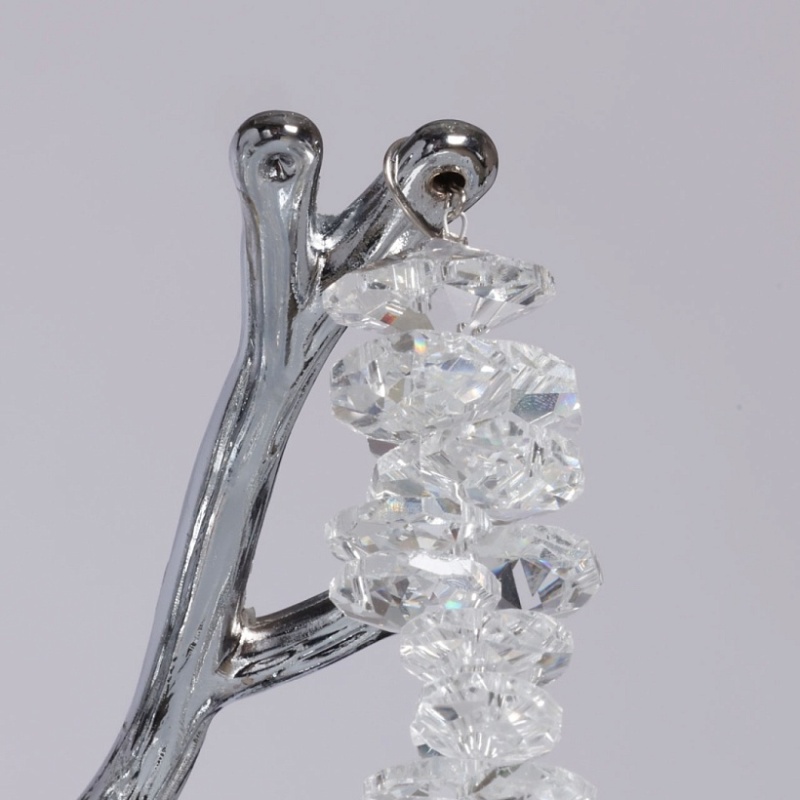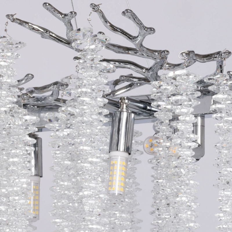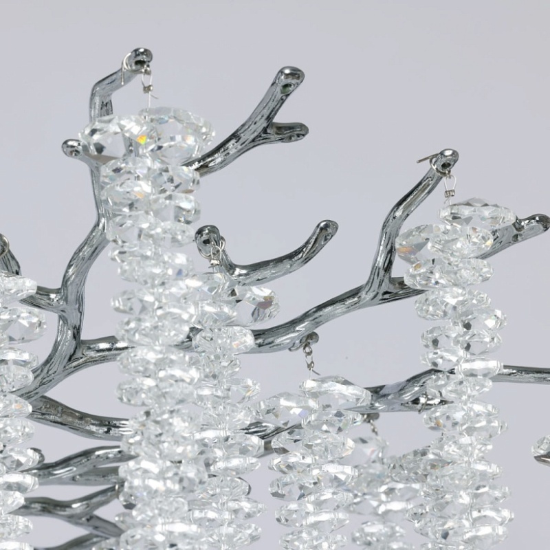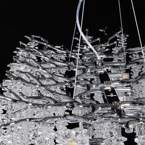 Основание подвесной люстры выполнено по технологии художественного литья из сплава алюминия с цинком и гальванизировано в цвет хрома. Люстра декорирована гроздьями из прозрачного хрусталя.