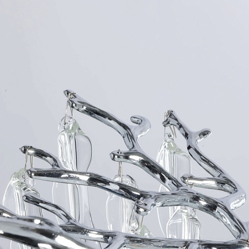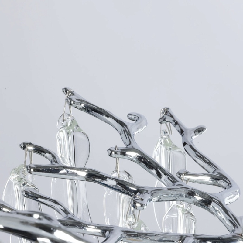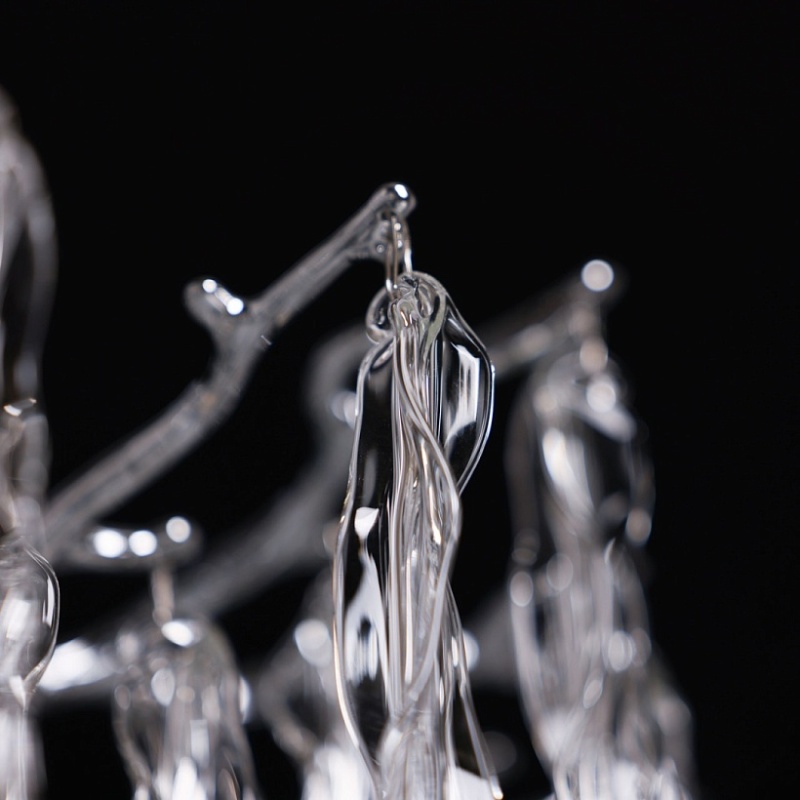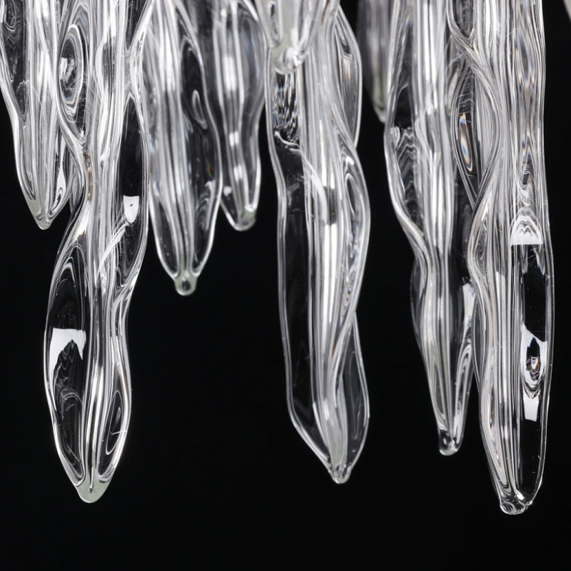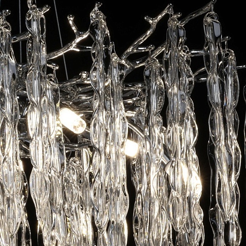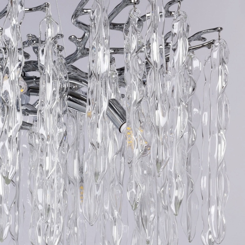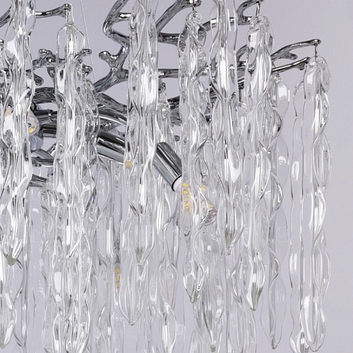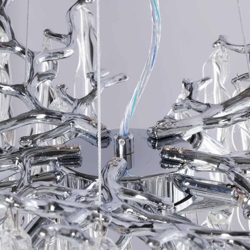 Основание подвесной люстры выполнено по технологии художественного литья из сплава алюминия с цинком и гальванизировано в цвет хрома. Потолочная чаша закрыта фактурным художественным литьем. Люстра декорирована подвесами из прозрачного стекла оригинальной формы.