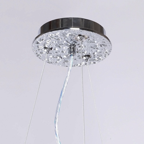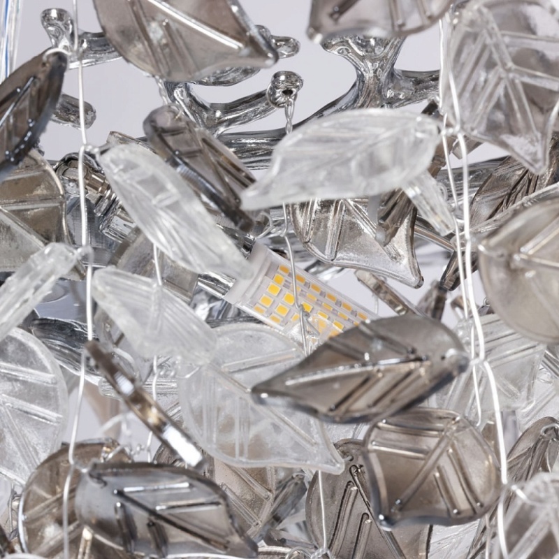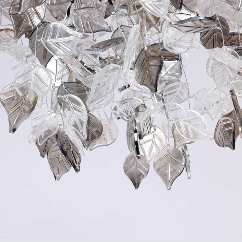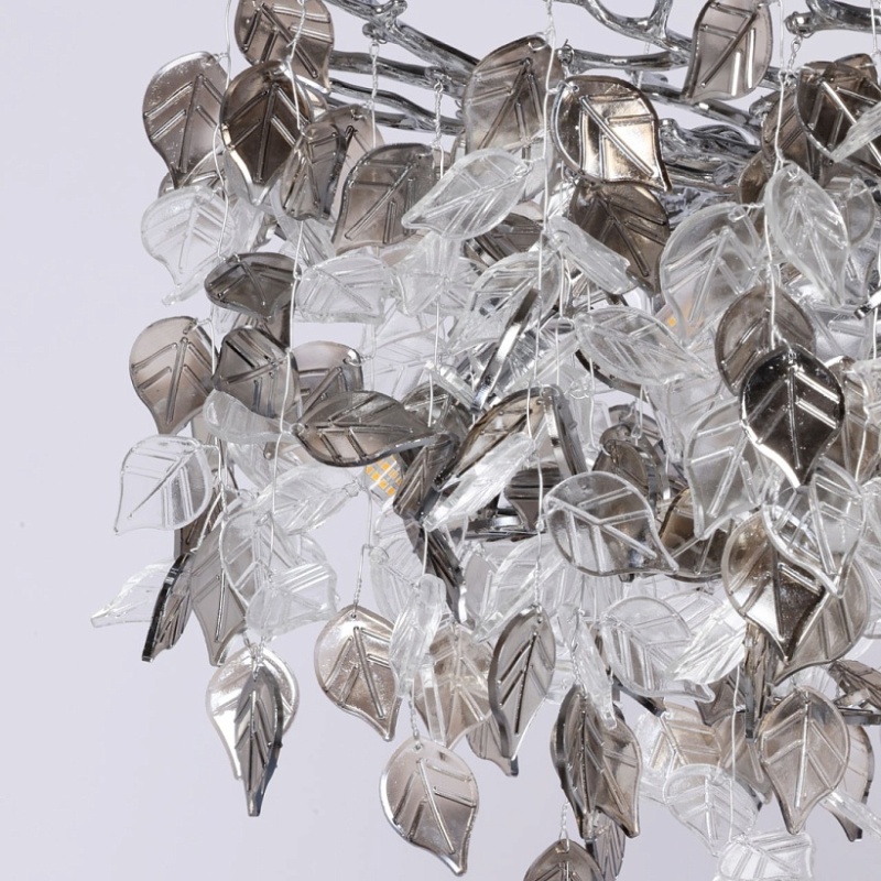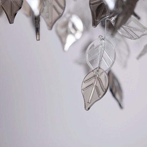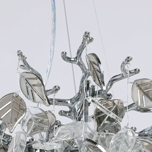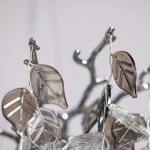 Основание подвесной люстры выполнено по технологии художественного литья из сплава алюминия с цинком и гальванизировано в цвет хрома. Потолочная чаша закрыта фактурным художественным литьем. Люстра декорирована подвесками из прозрачного и гальванизированного в дымчатый цвет стекла в форме листьев.