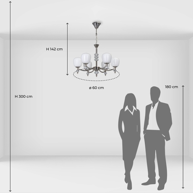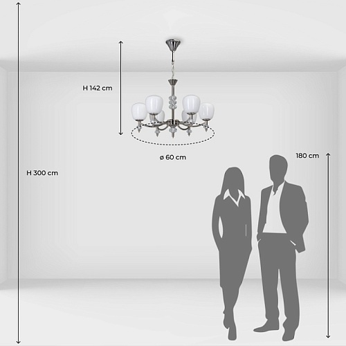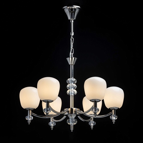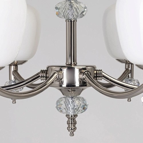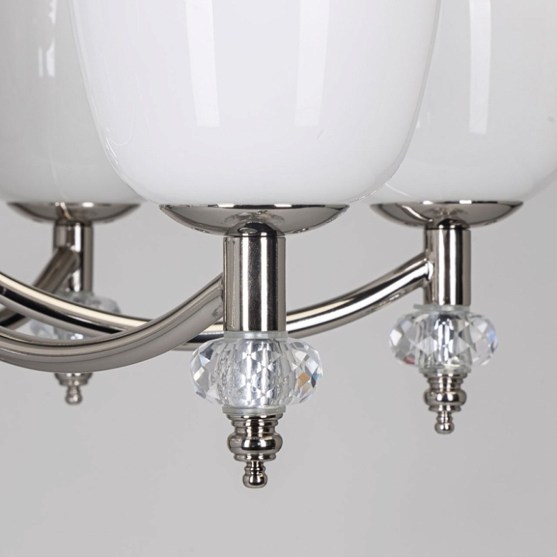 Металлическое основание светильника гальванизировано в цвет хрома. Стеклянные плафоны вытянутой формы окрашены в белый цвет изнутри. Люстра декорирована прозрачными массивами хрусталя.