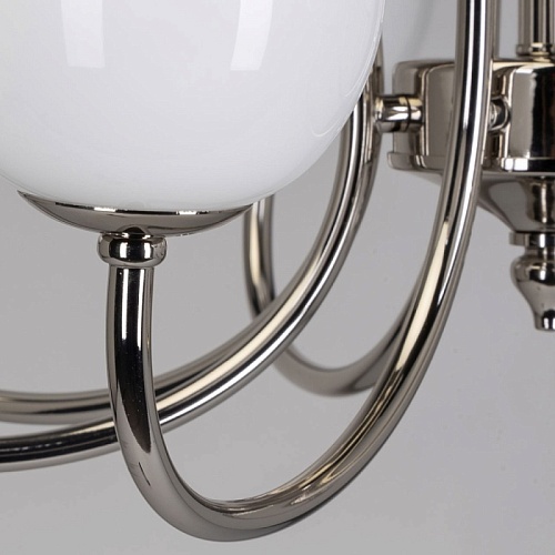 Металлическое основание светильника гальванизировано в цвет хрома. Стеклянные плафоны вытянутой формы окрашены в белый цвет изнутри.
