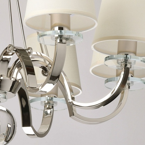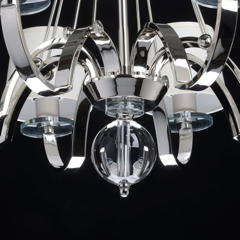 Металлическое основание светильника гальванизировано в цвет хрома. Источники света закрыты белыми текстильными абажурами с термостойким акрилом внутри. Светильник декорирован розетками и сферой из прозрачного массива хрусталя.