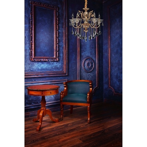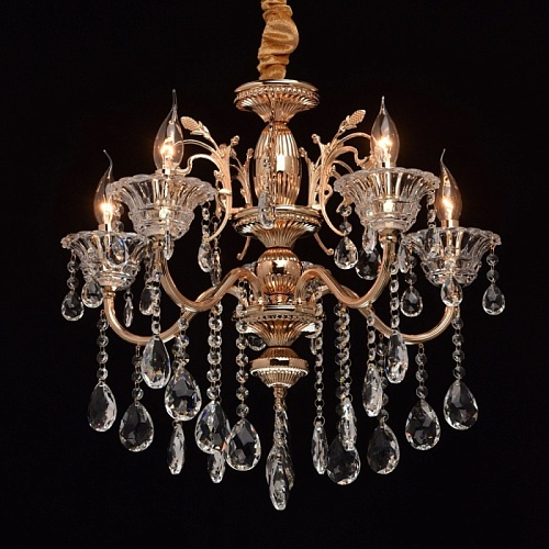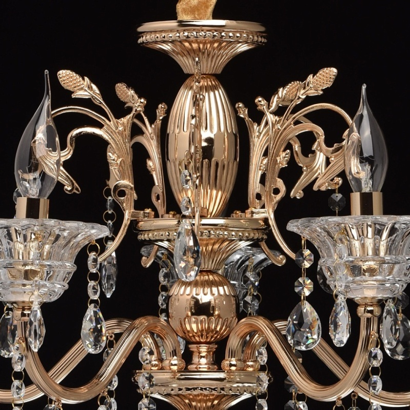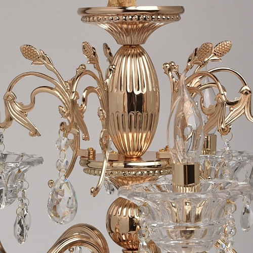 Основание светильника выполнено из сплава металла и гальванизировано в цвет французского золота. Рожки профилированы и выполнены по технологии проката на роликовом станке. Декоративные элементы центральной оси выполнены по технологии токарной обработки с последующим прессованием. Декоративная розетка в верхней части центральной оси выполнена из стали по технологии прессования. Декоративные элементы выполнены из сплава алюминия по технологии художественного литья. Декоративные розетки выполнены из стекла, отлитого в сложную форму. Светильник декорирован подвесками из хрусталя формы октагон и миндаль.