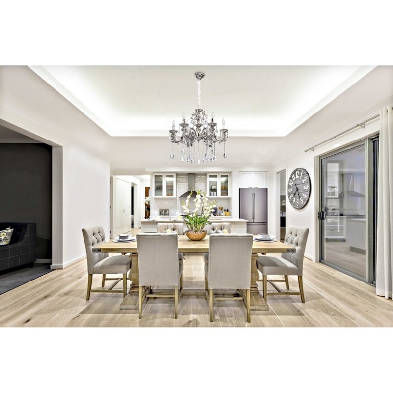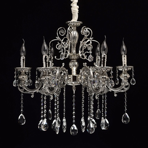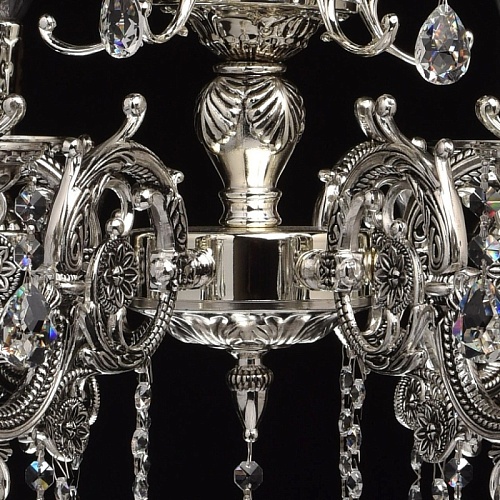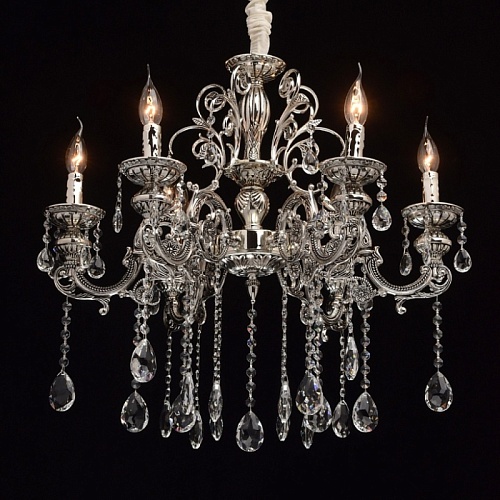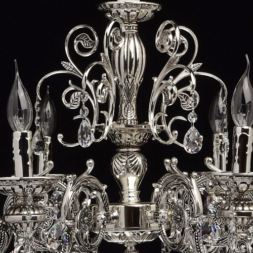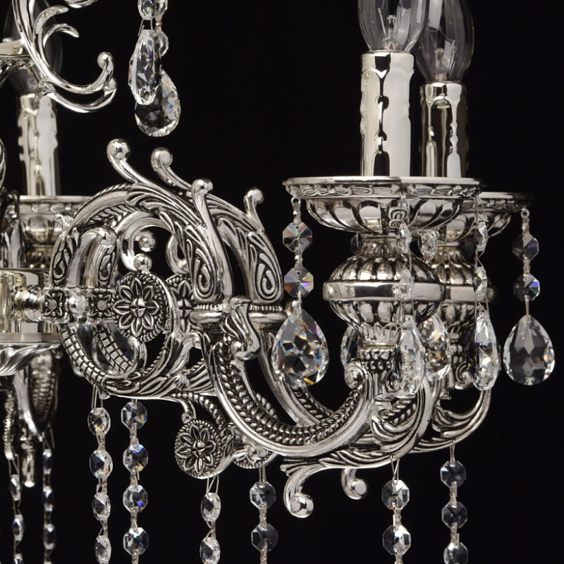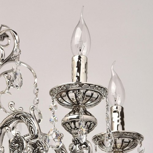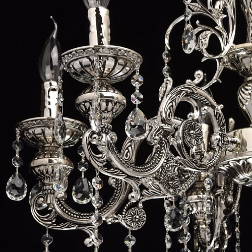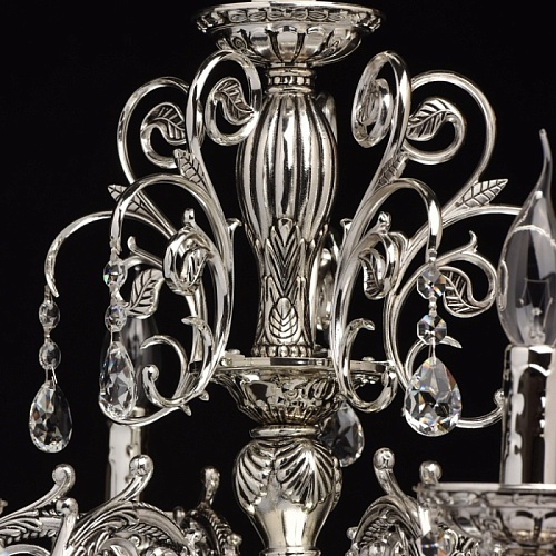 Арматура светильника выполнена из комбинации сплавов металлов, гальванизирована в цвет хрома и патинирована. Основание светильника, корпус и декоративный элемент под розеткой выполнены из стали. Рожки, элементы центральной оси, декоративные элементы, декоративные розетки выполнены из сплава алюминия по технологии художественного литья. Светильник декорирован подвесками из хрусталя формы октагон и миндаль.