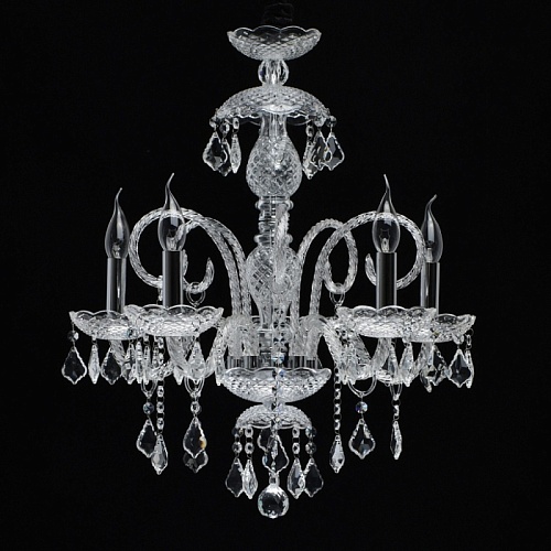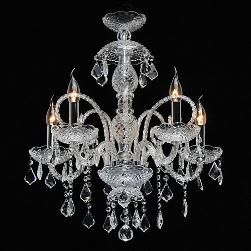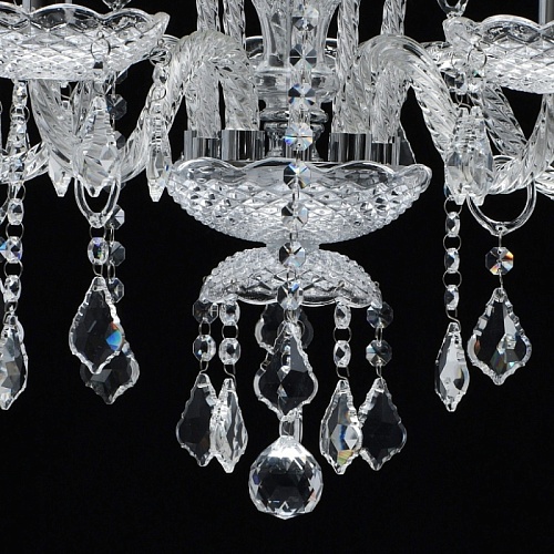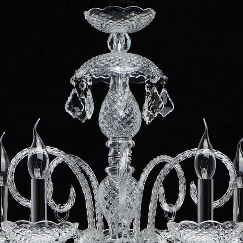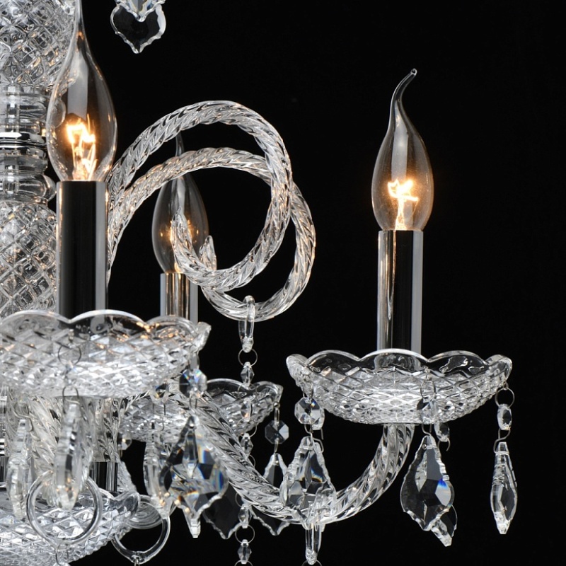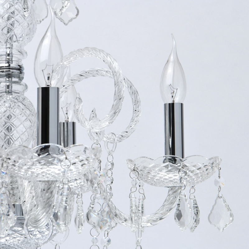 Основание светильника выполнено из металла и гальванизировано в цвет хрома. Рожки светильника выполнены из стекла гутным способом. Основание декорировано прозрачным стеклом, отлитым в сложную форму. Светильник декорирован прозрачным хрусталем формы октагон, шар и дубовый лист.